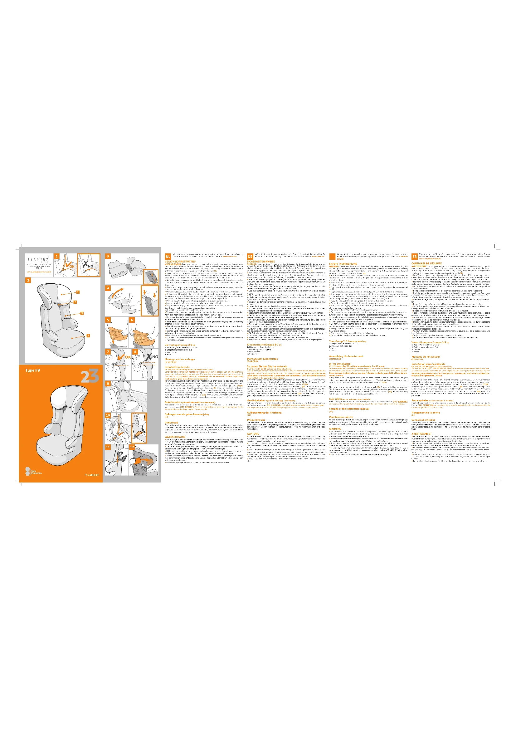 - Réglage de l’appui-tête: L’appui-tête réglable est conçu pour accompagner votre enfant tout au long de sa croissance en lui apportant une protection latérale maximum. Les guides cein- tures de l’appui-tête doivent être positionnés au plus près des épaules de votre enfant (7) (8). Placez le siège auto contre la banquette arrière du véhicule (9). Asseoir l’enfant sur le siège auto. Le brin diagonal de la ceinture passe dans le guide sangle de l’appui-tête et sous l’accoudoir opposé. Le brin ventral de la ceinture du véhicule passe sous les accoudoirs (10). Bouclez la ceinture du véhicule. Assurez-vous que la ceinture soit correctement tendue et qu’elle ne soit pas vrillée. Porte-gobelet (en option selon le modèle) Montez le porte-gobelet du siège auto en le glissant dans les guides situés de chaque côté de l’assise (11). ATTENTION: ne pas placer dans le porte-gobelet d’objets lourds susceptibles de devenir des projectiles en cas de choc. Rangement de la notice (12) Conseils d’entretien Toutes les parties textiles sont déhoussables. En cas de tâches légères, nettoyez à l’aide d’une éponge humidifiée avec de l’eau savonneuse ou lavez à la main à 30° dans de l’eau savonneuse. Ne pas utiliser de javel, ne pas repasser, ne pas laver en machine, ne pas mettre dans un sèche linge. AVERTISSEMENT