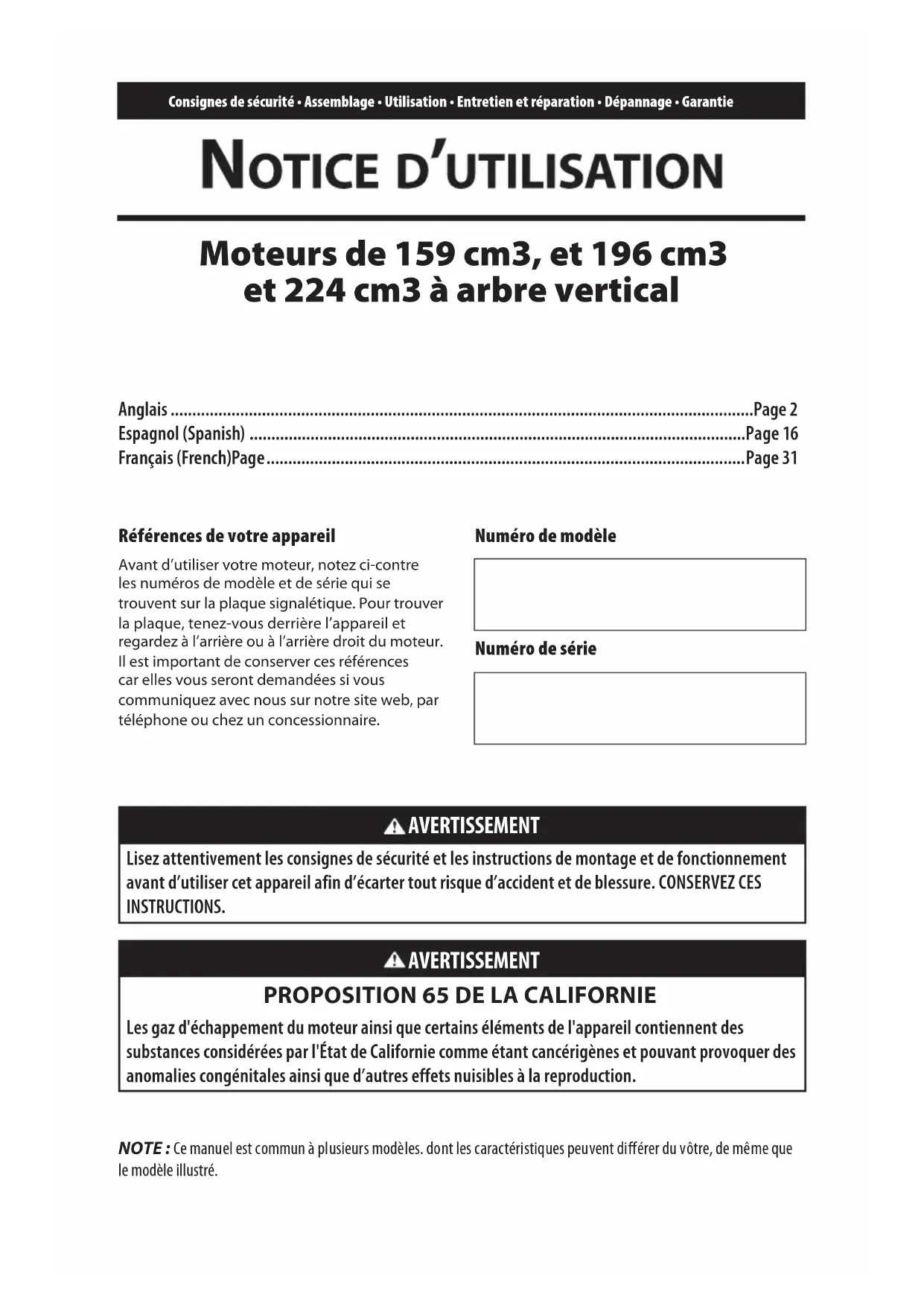 Les modèles de moteur indiqués sur la page couverture de ce manuel sont spécifiquement conçus pour être utilisés uniquement pour les appareils motorisés d'extérieur désignés. Les moteurs indiqués sont homologués comme moteur de remplacement pour les appareils comme les tondeuses, les coupe-bordures et les tondeuses à fil. L'utilisation de ces moteurs n'est autorisée pour aucun autre appareil. La garantie du moteur sera nulle et non avenue si les moteurs sont utilisés pour des appareils non autorisés ou ont subi des altérations ou n'ont pas été utilisés correctement.