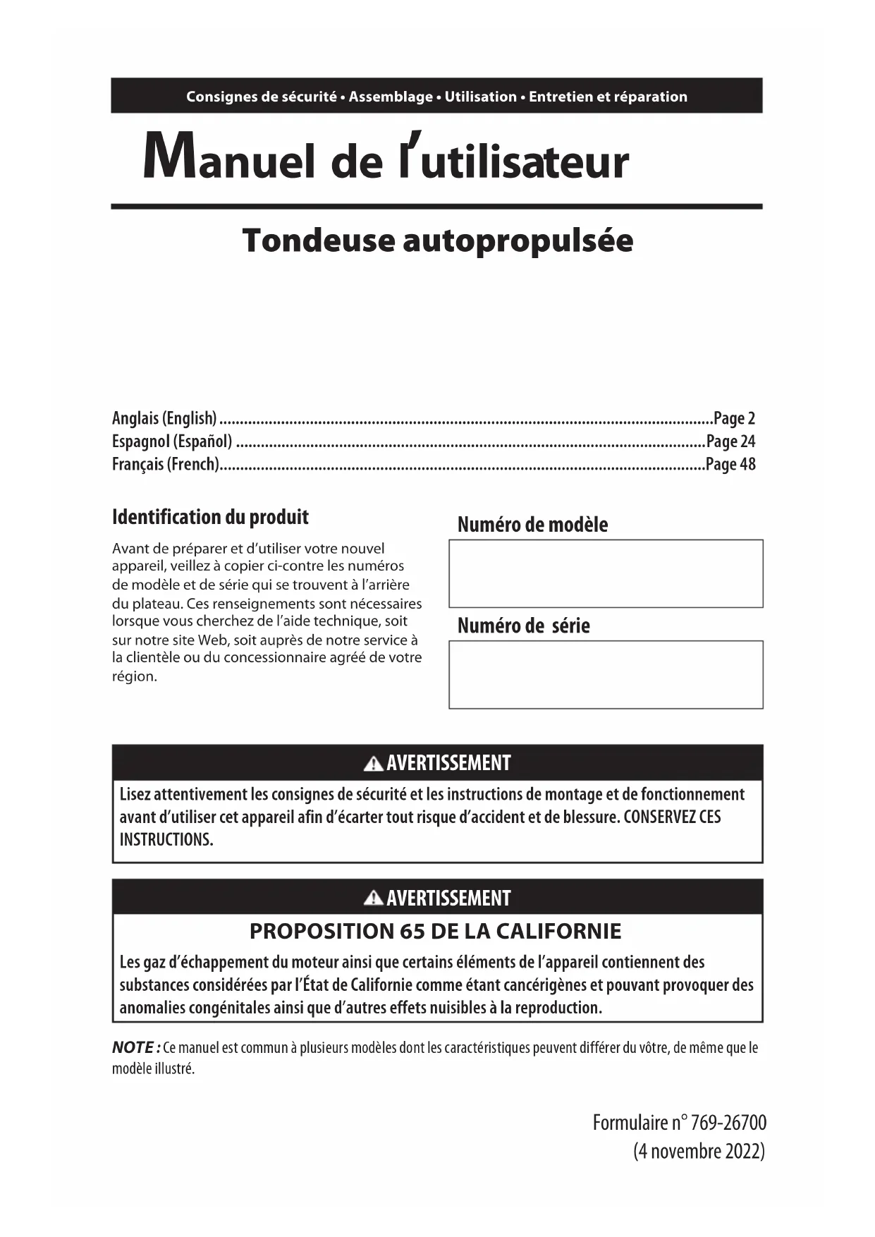 Les gaz d’échappement du moteur ainsi que certains éléments de l’appareil contiennent des substances considérées par l’État de Californie comme étant cancérigènes et pouvant provoquer des anomalies congénitales ainsi que d’autres effets nuisibles à la reproduction. Identification du produit Avant de préparer et d’utiliser votre nouvel appareil, veillez à copier ci-contre les numéros de modèle et de série qui se trouvent à l’arrière du plateau. Ces renseignements sont nécessaires lorsque vous cherchez de l’aide technique, soit sur notre site Web, soit auprès de notre service à la clientèle ou du concessionnaire agréé de votre région. Numéro de modèle Numéro de série Anglais (English) ........................................................................................................................Page 2 Espagnol (Español) ..................................................................................................................Page 24 Français (French) ......................................................................................................................Page 48 Formulaire n° 769-26700 (4 novembre 2022)49