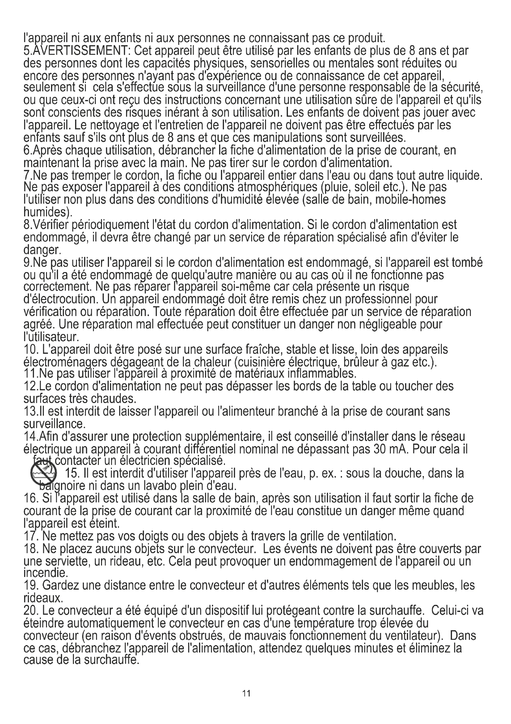 18. Ne placez aucuns objets sur le convecteur. Les évents ne doivent pas être couverts par