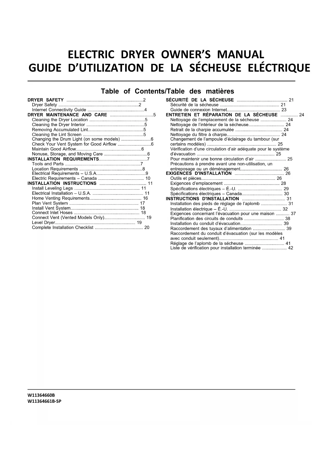 certains modèles) Installation : Placer la jupe au bas de la sécheuse et faire correspondre les goupilles de positionnement avec les trous. Appuyer sur la jupe fermement vers le haut jusqu’à ce qu’elle s’enclenche. Retrait : Dans chaque coin, pousser vers le bas le dessus de la tringle de base. La faire pivoter de la sécheuse, puis la retirer. Liste de vérification pour installation terminée q Vérifier que toutes les pièces sont maintenant installées. S’il reste une pièce, passer en revue les différentes étapes pour découvrir laquelle aurait été oubliée. q Vérifier la présence de tous les outils. q Éliminer/recycler tous les matériaux d’emballage. q Vérifier que les robinets d’eau sont ouverts. q Vérifier qu’il n’y a pas de fuites autour du raccord en « Y », du robinet et des tuyaux. q Vérifier l’emplacement définitif de la sécheuse. S’assurer que le conduit d’évacuation n’est pas écrasé ou déformé. q Vérifier que la sécheuse est d’aplomb. Voir la section « Réglage de l’aplomb de la sécheuse ». q Ôter la pellicule protectrice de la console et tout ruban adhésif resté sur la sécheuse. q Essuyer soigneusement l’intérieur du tambour de la sécheuse avec un chiffon humide pour éliminer toute trace de poussière. q Pour une installation avec cordon d’alimentation électrique, brancher dans une prise reliée à la terre. Pour une installation à raccordement direct, mettre l’appareil sous tension. q Si l’on réside dans une région où l’eau est dure, l’emploi d’un adoucisseur d’eau est recommandé pour contrôler l’accumulation de tartre dans le circuit d’eau de la sécheuse. Avec le temps, l’accumulation de tartre peut obstruer différentes parties du circuit d’eau, ce qui réduira la performance du produit. Une accumulation excessive de tartre peut entraîner la nécessité de remplacer ou de réparer certains composants. q Pour inverser le sens d’ouverture de la porte de la sécheuse, consulter la section « Instructions pour inversion de porte de sécheuse » en ligne. q Utiliser un programme avec chaleur de 20 minutes, puis mettre en marche la sécheuse. Ne pas sélectionner le réglage de température Air Only (air seulement). Si la sécheuse ne démarre pas, vérifier ce qui suit : n Les commandes sont réglées à la position de marche ou « ON » (marche). n On a appuyé fermement sur le bouton Start (mise en marche). n La sécheuse est branchée dans une prise ou l’alimentation électrique. n Le fusible domestique est intact et bien visé ou le disjoncteur n’est pas ouvert. n La porte de la sécheuse est fermée. q Après 5 minutes de fonctionnement, ouvrir la porte de la sécheuse et voir s’il y a de la chaleur. Si de la chaleur est détectée, annuler le programme et fermer la porte. Si la sécheuse n’est pas chaude à l’intérieur, éteindre la sécheuse et vérifier ce qui suit : n Il peut y avoir 2 fusibles ou disjoncteurs domestiques pour la sécheuse. Vérifier que les deux fusibles sont intacts et bien en place ou que les deux disjoncteurs ne se sont pas déclenchés. S’il n’y a toujours pas de chaleur, contacter un technicien qualifié. REMARQUE : Il est possible que la sécheuse dégage une certaine odeur lorsqu’elle chauffe pour la première fois. Cette odeur est normale lorsque l’élément chauffant est utilisé pour la première fois. L’odeur disparaîtra. Si l’écran de circulation d’air affiche « Check Vent » (vérifier le conduit d’évacuation), il est possible que le conduit d’évacuation de la sécheuse soit écrasé ou bloqué. W11364660B W11364661B-SP