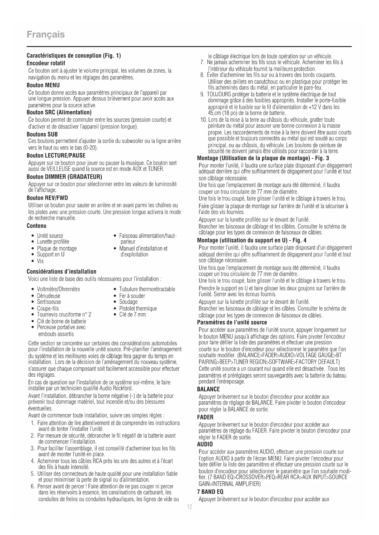 peinture du métal pour assurer une bonne connexion à la masse propre. Les raccordements de mise à la terre doivent être aussi courts que possible et toujours connectés au métal qui est soudé au corps principal, ou au châssis, du véhicule. Les boulons de ceinture de sécurité ne doivent jamais être utilisés pour raccorder à la terre. Montage (Utilisation de la plaque de montage) - Fig. 3 Pour monter l’unité, il faudra une surface plate disposant d’un dégagement adéquat derrière qui offre suffisamment de dégagement pour l’unité et tout son câblage nécessaire. Une fois que l’emplacement de montage aura été déterminé, il faudra couper un trou circulaire de 77 mm de diamètre. Une fois le trou coupé, faire glisser l’unité et le câblage à travers le trou. Faire glisser la plaque de montage sur l’arrière de l’unité et la sécuriser à l’aide des vis fournies. Appuyer sur la lunette profilée sur le devant de l’unité. Brancher les faisceaux de câblage et les câbles. Consulter le schéma de câblage pour les types de connexion de faisceaux de câbles. Montage (utilisation du support en U) - Fig. 4 Pour monter l’unité, il faudra une surface plate disposant d’un dégagement adéquat derrière qui offre suffisamment de dégagement pour l’unité et tout son câblage nécessaire. Une fois que l’emplacement de montage aura été déterminé, il faudra couper un trou circulaire de 77 mm de diamètre. Une fois le trou coupé, faire glisser l’unité et le câblage à travers le trou. Prendre le support en U et faire glisser les deux goujons sur l’arrière de l’unité. Serrer avec les écrous fournis. Appuyer sur la lunette profilée sur le devant de l’unité. Brancher les faisceaux de câblage et les câbles. Consulter le schéma de câblage pour les types de connexion de faisceaux de câbles. Paramètres de l’unité source Pour accéder aux paramètres de l’unité source, appuyer longuement sur le bouton MENU jusqu’à affichage des options. Faire pivoter l’encodeur pour faire défiler la liste des paramètres et effectuer une pression courte sur le bouton d’encodeur pour sélectionner le paramètre que l’on souhaite modifier. (BALANCE>FADER>AUDIO>VOLTAGE GAUGE>BT PAIRING>BEEP>TUNER REGION>SOFTWARE>FACTORY DEFAULT) Cette unité source a un courant nul quand elle est désactivée. Tous les paramètres et préréglages seront sauvegardés avec la batterie du bateau pendant l’entreposage. BALANCE Appuyer brièvement sur le bouton d’encodeur pour accéder aux paramètres de réglage de BALANCE. Faire pivoter le bouton d’encodeur pour régler la BALANCE de sortie. FADER Appuyer brièvement sur le bouton d’encodeur pour accéder aux paramètres de réglage du FADER. Faire pivoter le bouton d’encodeur pour régler le FADER de sortie. AUDIO Pour accéder aux paramètres AUDIO, effectuer une pression courte sur l’option AUDIO à partir de l’écran MENU. Faire pivoter l’encodeur pour faire défiler la liste des paramètres et effectuer une pression courte sur le bouton d’encodeur pour sélectionner le paramètre que l’on souhaite modi- fier. (7 BAND EQ>CROSSOVER>PEQ>REAR RCA>AUX INPUT>SOURCE GAIN>INTERNAL AMPLIFIER) 7 BAND EQ Appuyer brièvement sur le bouton d’encodeur pour accéder aux13 Français paramètres 7 BAND EQ. Utiliser l’encodeur rotatif pour faire défiler les paramètres EQ. (FLAT > ROCK > CLASSIC > ACOUSTIC > DANCE > ELECTRONIC > HIP-HOP > CUSTOM) Lors de la configuration du CUSTOM EQ, effectuer une pression courte sur le bouton d’encodeur pour régler la première fréquence. Une fois activé, faire pivoter l’encodeur pour ajuster les paramètres de fréquence. Effectuer une autre pression courte sur le bouton d’encodeur pour accéder à la fréquence prochaine. Répéter jusqu’à ce que tous les paramètres EQ soient terminés. Appuyer briève- ment sur le bouton MENU pour quitter et revenir d’un niveau en arrière. CROISEMENT Appuyer brièvement pour accéder aux paramètres de CROISEMENT. Utiliser l’encodeur rotatif pour sélectionner les options de zones de croisement (FRONT>REAR>SUB). Effectuer une courte pression sur l’encodeur pour ajuster la fréquence du croisement (60 Hz>80 Hz>120 Hz>APF). Appuyer brièvement sur le bouton MENU pour quitter et revenir d’un niveau en arrière.