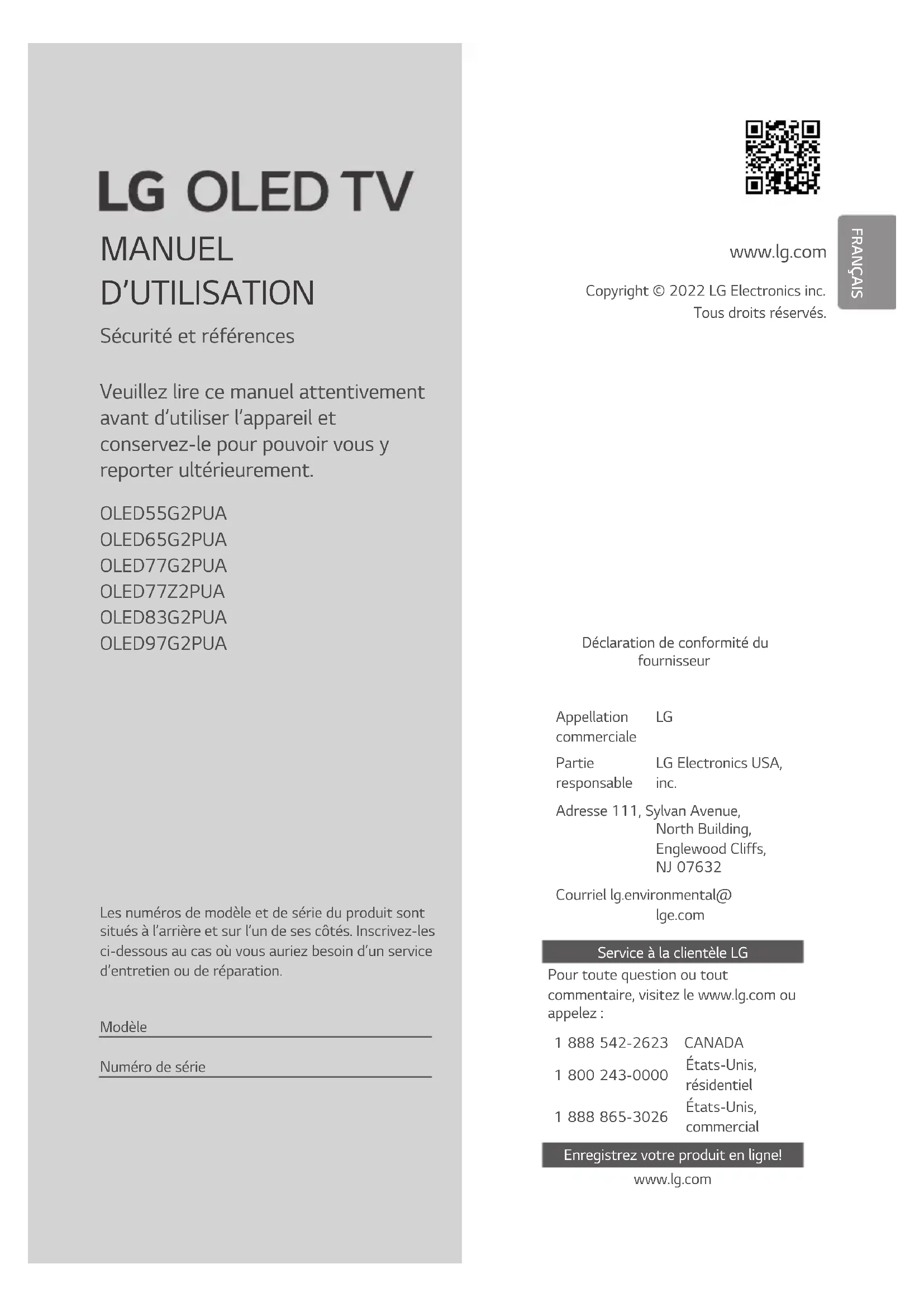 Partie responsable LG Electronics USA, inc. Adresse 111, Sylvan Avenue, North Building, Englewood Cliffs, NJ07632 Courriel lg.environmental@ lge.com Service à la clientèle LG Pour toute question ou tout commentaire, visitez le www.lg.com ou appelez : 1888542-2623 CANADA 1800243-0000 États-Unis, résidentiel 1888865-3026 États-Unis, commercial Enregistrez votre produit en ligne! www.lg.com2 Directives de sécurité importantes