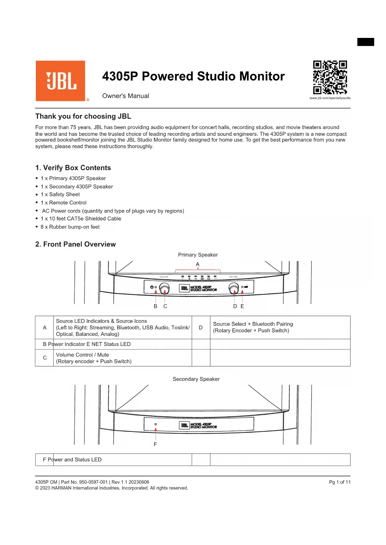 Enceinte secondaire F Témoin d'alimentation et d'état www.jbl.com/specialtyaudioFR Pg 2 de 11 4305P OM | Réf. : 950-0597-001 | Rev 1.1 20230606 © 2023 HARMAN International Industries, Incorporated. Tous droits réservés.
