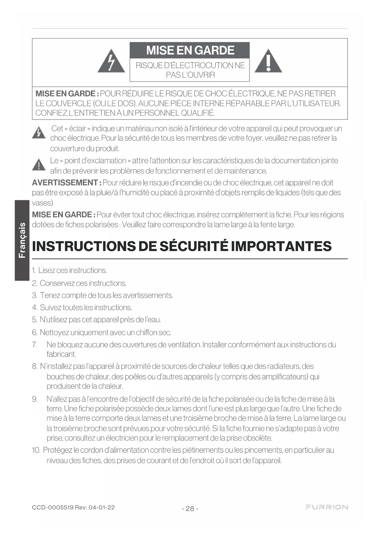 niveau des fiches, des prises de courant et de l’endroit où il sort de l’appareil. CCD-0005519 Rev: 04-01-22 - 28 - Français11. N'utilisez que les fixations/accessoires spécifiées par le fabricant.