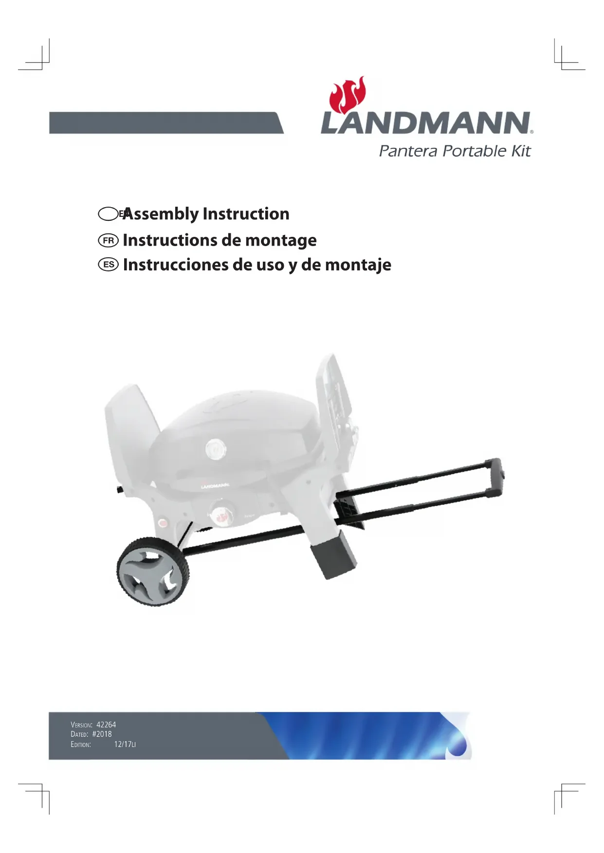 Part Description QTY Part # AA Wheel Cover 2 KP0023 AB Wheel 2 KP0022 AC Stand Bumper 2 PT0077 AD Axle Sleeve 2 PT0078 AE Axle 1 PT0079 AF Extension Handle 1 PT0080 AG Front Leg Extention 1 PT0081 AH Rear Leg Extention 1 PT0133 Parts Not Shown Instruction Manual 1 PT0082 Hardware Pack 1 PT00838 Pantera Portable Kit 42264 Liste des pièces de rechange 42264 Lista piezas de repuesto Pièce Description Qté Pièce # AA Recouvrement des roues 2 KP0023 AB Roue 2 KP0022 AC Pare-chocs du socle 2 PT0077 AD Manchon pour essieu 2 PT0078 AE Essieu 1 PT0079 AF Manche à rallonge 1 PT0080 AG Rallonge de pied avant 1 PT0081 AH Rallonge de pied arrière 1 PT0133 Pièces non illustré Instructions de service 1 PT0082 Pack matériel 1 PT0083 Pieza Descripción Cantidad Pieza # AA Cubierta de rueda 2 KP0023 AB Rueda 2 KP0022 AC Defensa 2 PT0077 AD Manguito de eje 2 PT0078 AE Eje 1 PT0079 AF Mango de extensión 1 PT0080 AG Extensión de pata delantera 1 PT0081 AH Extensión de pata trasera 1 PT0133 Piezas no mostradas Manual de instrucciones 1 PT0082 Paquete de hardware 1 PT00839 Pantera Portable Kit Warranty Garantie This Product is warranted to be free of defects in material and workmanship when properly assembled, used in a normal outdoor setting and cared for as directed in these instructions for the below time periods from the date of the original retail purchase. 2 years - All parts This warranty does not cover rust, fading, peeling damage or issues related to neglect, abuse, accident, misuse, misapplication, improper assembly, transportation damages, commercial use or ANY modifications made to this product. Repair labor is not covered. This warranty is the only warranty offered and is in lieu of all other warranties, whether expressed or implied, which includes implied warranty, merchandising or use for a particular purpose. All replacement parts that meet the warranty requirements will be shipped at no charge via the discretion of the manufacturer (ground shipments, US Mail, UPS or FedEx). Any special handling charges (i.e. Second Day, overnight, etc.) will be the responsibility of the consumer. All warranty claims apply only to the original purchaser and require a proof of purchase verifying the purchase date. Do not return parts without first obtaining a return authorization number from our customer service department. Our customer service department can be reached at 1-800-321-3473 8:00 AM - 5:00 PM (EST) English Only, or Email CustomerService@landmann-usa.com Please note for the United States, that some state states do not allow the exclusion or limitation of incident or consequential damages or limitations on how long an implied warranty lasts, so the above limitations or exclusions may not apply to you. This warranty gives you specific legal rights and you may also have other legal rights which may vary from state to state. Ce produit est garanti exempt de défauts de matériaux et de fabrication s’il est assemblé correctement, utilisé dans un environnement extérieur et entretenu comme indiqué dans ces instructions pour les périodes de temps mentionnées ci-dessous, à compter de la date de l’achat au détail d’origine. 2 ans - toutes les pièces Cette garantie ne couvre pas les dommages dus à la corrosion, la décoloration, l’écaillement ou les problèmes liés à la négligence, une utilisation abusive, un accident, une utilisation incorrecte, une application non conforme, un montage incorrect, des dommages de transport, une utilisation commerciale ou TOUTE modification apportée à ce produit. Les coûts de main d’œuvre pour la réparation ne sont pas couverts. Cette garantie est la seule garantie offerte et remplace toutes les autres garanties, implicites ou explicites, ce qui inclut la garantie tacite, le merchandising ou l’utilisation à une fin particulière. Toutes les pièces de rechange qui satisfont les exigences de garantie seront expédiées sans frais à la discrétion du fabricant (expéditions par voie terrestre, US Mail, UPS ou FedEx). Les frais de traitement spéciaux (par ex. le lendemain ou surlendemain) seront à la charge du client. Toutes les réclamations en garantie s’appliquent uniquement à l’acheteur original et requièrent une preuve de l’achat certifiant la date d’achat. Ne pas renvoyer de pièces sans avoir au préalable obtenu un numéro d’autorisation de retour de notre service après-vente. Notre service après-vente peut être contacté au : 1-800-321-3473 de 8h00 à 17h00 (EST) (anglais uniquement), ou par courriel à : CustomerService@landmann-usa.com Noter que pour les États-Unis, certains états n’autorisent pas l’exclusion ou la limitation des dommages accidentels ou consécutifs ou des limitations de la durée d’une garantie tacite, les limitations ou exclusions susmentionnées ne s’appliquent donc pas dans ce cas. Cette garantie vous confère des droits légaux spécifiques, et vous pouvez également disposer d’autres droits légaux qui peuvent varier d’un état à l’autre.10 Pantera Portable Kit LANDMANN