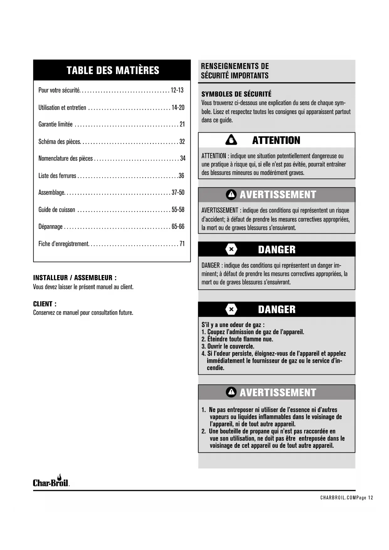 - -66 Fiche d’enregistrement CHARBROIL.COMPage 13 POUR VOTRE SÉCURITÉ – INSTALLATION DE VOTRE GRIL ATTENTION DANGER Pour utilisation domestique uniquement. Ne pas utiliser à des fins commerciales. Lire et respecter toutes les consignes de sécurité, les instructions d’assemblage et les directives d’emploi et d’entretien avant d’essayer d’assembler cet appareil ou de l’utiliser pour la cuisson. Certaines pièces peuvent être munies de bords coupantsl. Portez des gants de protection au besoin. Incendies de Graisse p. 71