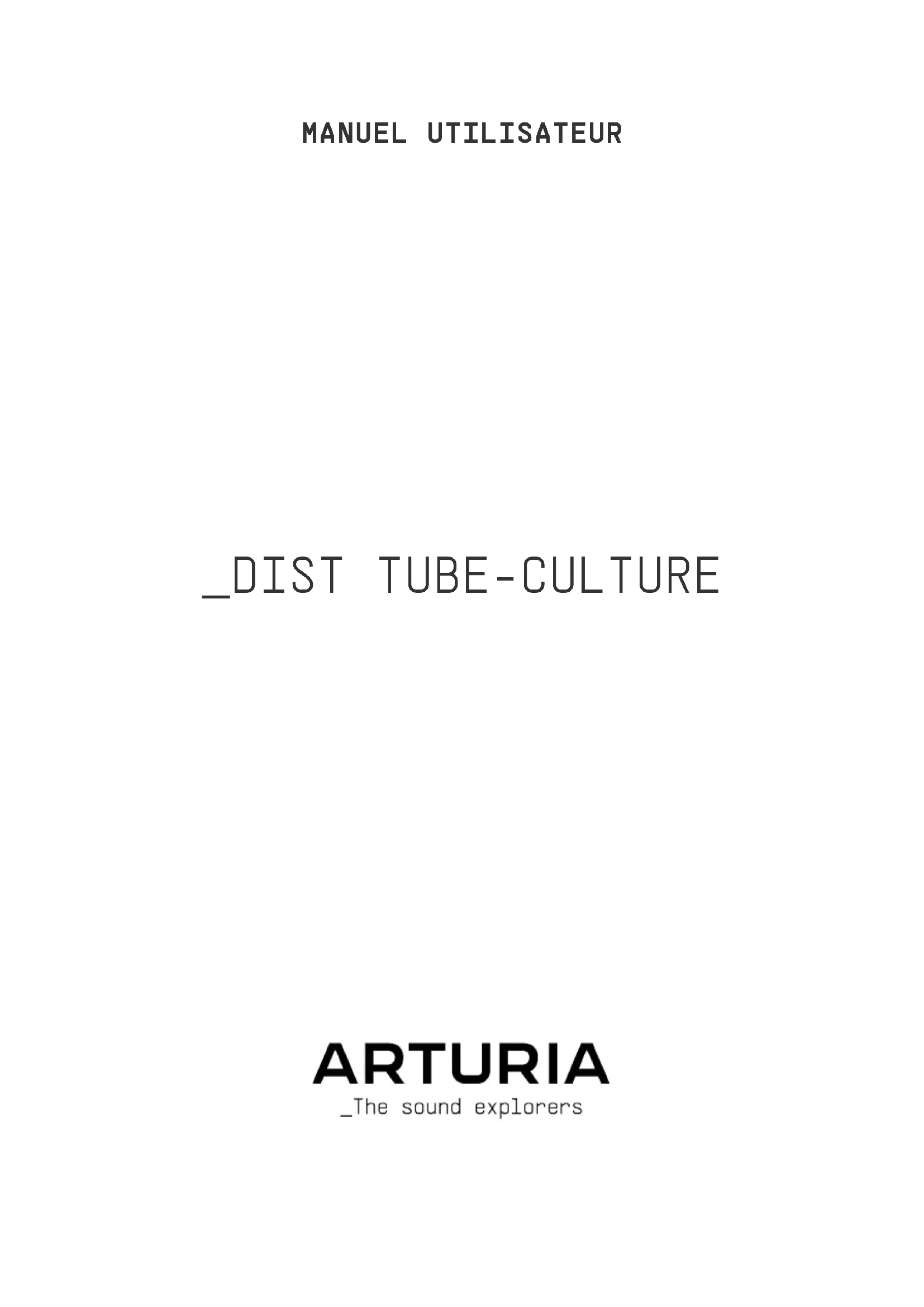 - Mat Herbert Ivar Jay Janssen Davide Puxeddu Axel Teulon TJ Trifeletti © ARTURIA SA – 2022 – Tous droits réservés. 26 avenue Jean Kuntzmann 38330 Montbonnot-Saint-Martin FRANCE www.arturia.comLes informations contenues dans ce manuel sont susceptibles d’être modifiées sans préavis et n’engagent aucunement la responsabilité d’Arturia. Le logiciel décrit dans ce manuel est fourni selon les termes d’un contrat de licence ou d’un accord de non-divulgation. Le contrat de licence spécifie les termes et conditions de son utilisation licite. Ce manuel ne peut être reproduit ou transmis sous n’importe quelle forme ou dans un but autre que l’utilisation personnelle de l’utilisateur, sans la permission écrite de la société ARTURIA S.A. Tous les autres produits, logos ou noms de sociétés cités dans ce manuel sont des marques ou des marques déposées appartenant à leurs propriétaires respectifs. Product version: 1.0.0 Revision date: 16 June 2022Informations importantes Ce manuel couvre l'utilisation de la Dist TUBE-CULTURE, fournit un aperçu exhaustif de ses fonctionnalités, et détaille les étapes de téléchargement et d'activation du logiciel. Mais d'abord, quelques informations importantes : Spécifications susceptibles d'être modifiées : Les informations contenues dans ce manuel sont correctes au moment de son impression. Cependant, Arturia se réserve le droit de changer ou de modifier les spécifications ou fonctionnalités sans préavis ou ni obligation de mettre à jour l’équipement ayant été acheté. IMPORTANT : Le produit et son logiciel, lorsqu’utilisés avec un amplificateur, un casque ou des haut- parleurs, peuvent produire des niveaux sonores susceptibles de provoquer une perte d’audition permanente. NE PAS faire fonctionner de manière prolongée à un niveau sonore trop élevé ou inconfortable. En cas de perte d’audition ou d’acouphènes, veuillez consulter un ORL. NOTICE : Les frais encourus en raison d’un manque de connaissance relatif à l‘utilisation de l’équipement (lorsqu'il fonctionne normalement) ne sont pas couverts par la garantie du fabricant et sont, par conséquent, à la charge du propriétaire de l’appareil. Veuillez lire attentivement ce manuel et demander conseil à votre revendeur avant d’avoir recours à l’assistance.Table des Matières 1. Bienvenue dans la Dist TUBE-CULTURE p. 3