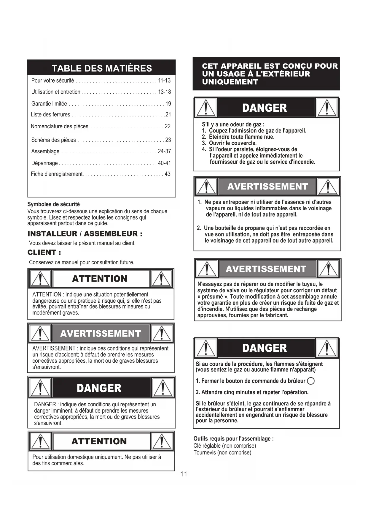 N'essayez pas de réparer ou de modifier le tuyau, le système de valve ou le régulateur pour corriger un défaut « présumé ». Toute modification à cet assemblage annule votre garantie en plus de créer un risque de fuite de gaz et d'incendie. N'utilisez que des pièces de rechange approuvées, fournies par le fabricant.