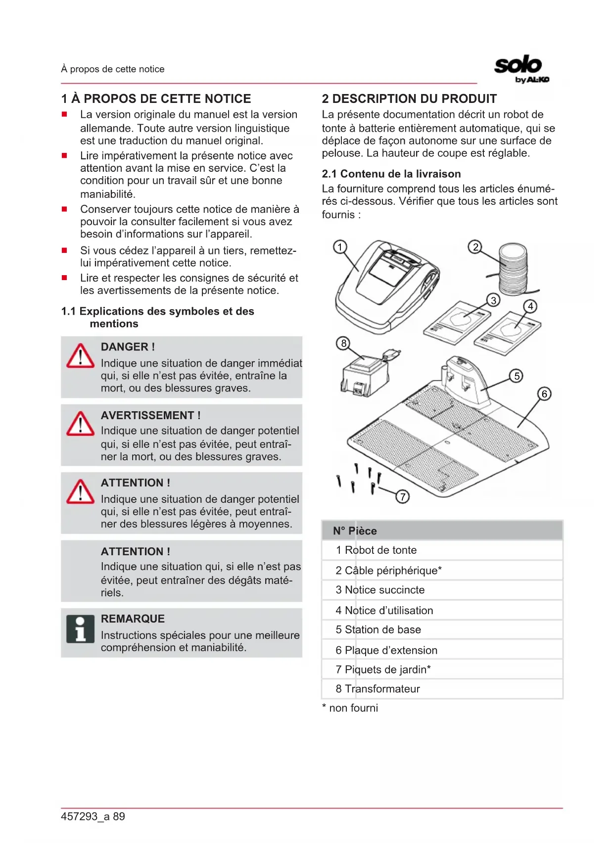 N° Pièce 1 Robot de tonte 2 Câble périphérique* 3 Notice succincte 4 Notice d’utilisation 5 Station de base 6 Plaque d’extension 7 Piquets de jardin* 8 Transformateur