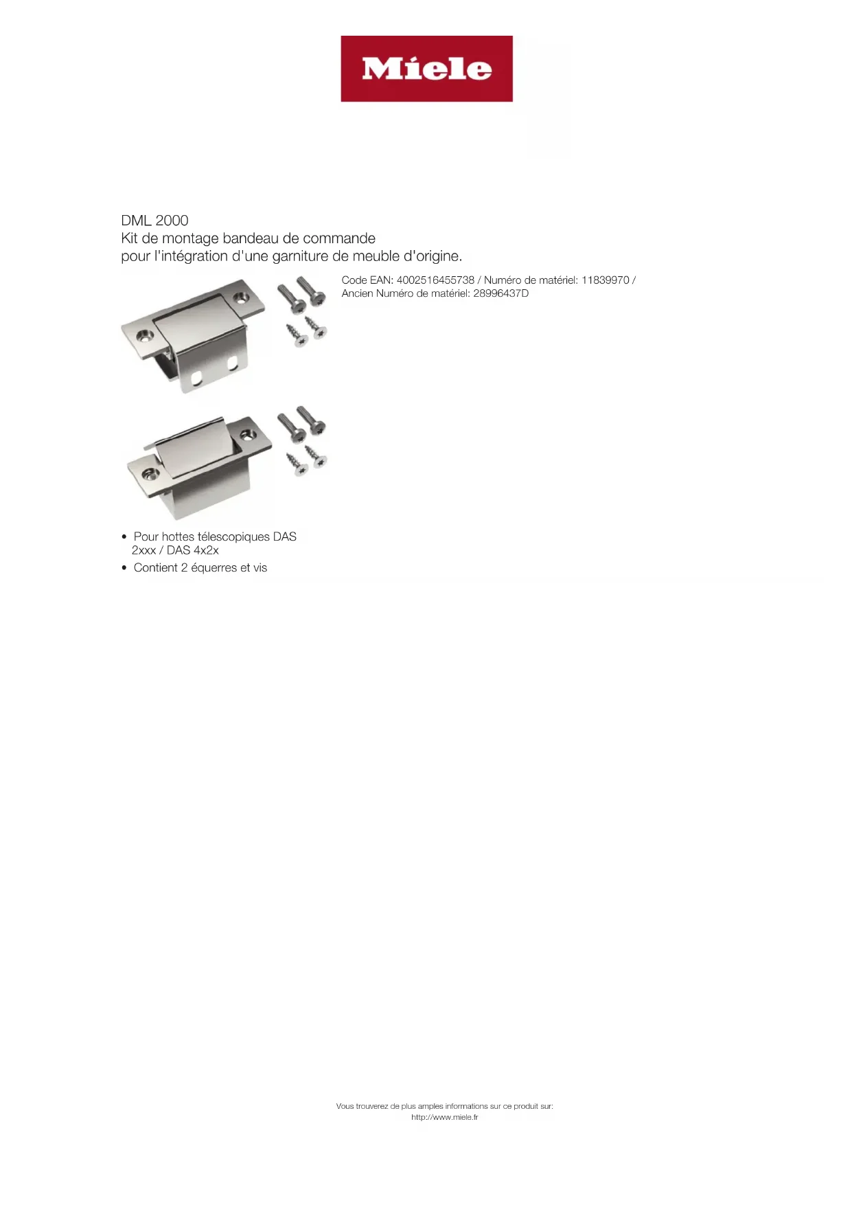DML 2000 Kit de montage bandeau de commande pour l'intégration d'une garniture de meuble d'origine. Vous trouverez de plus amples informations sur ce produit sur: http://www.miele.fr