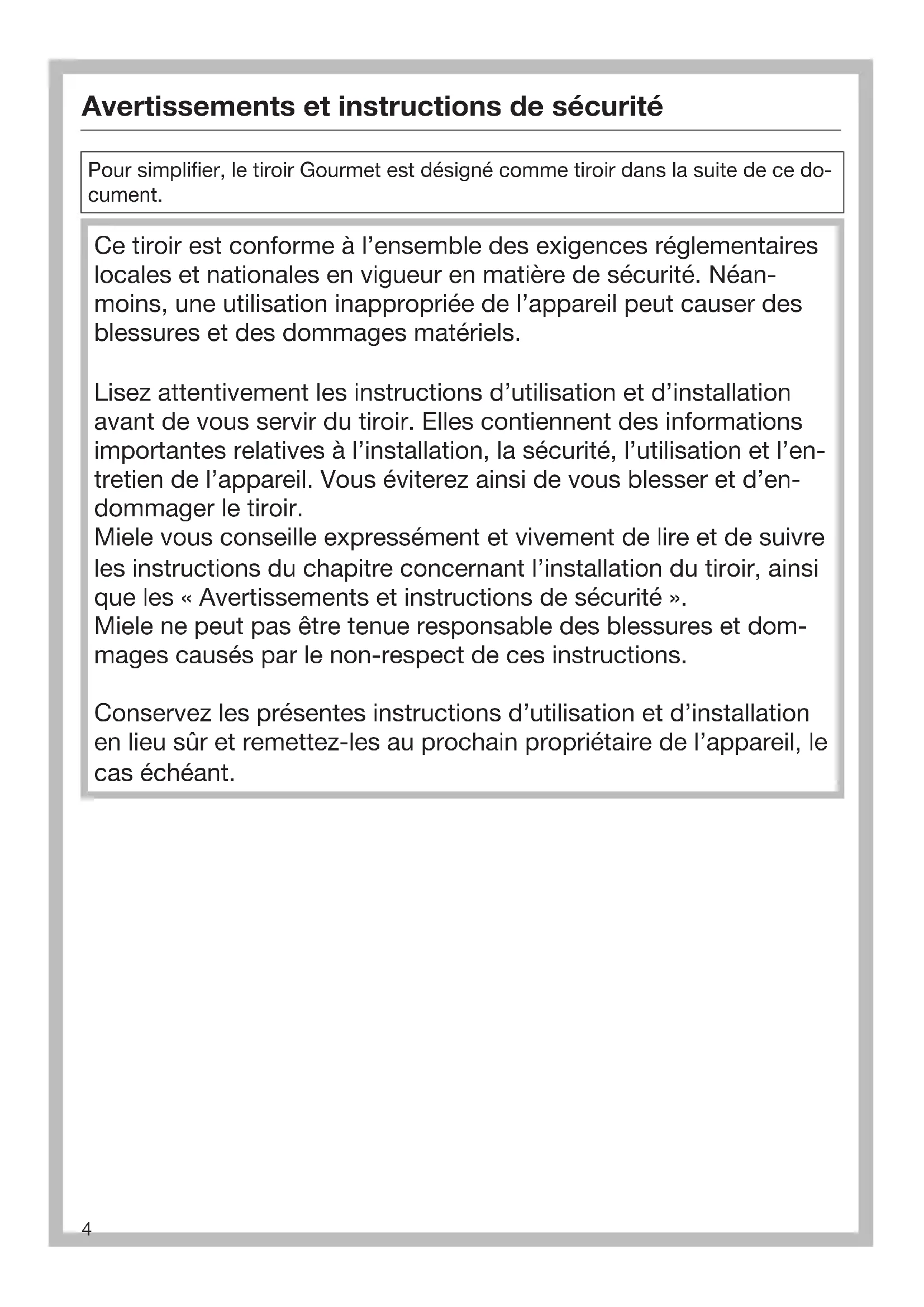 Pour simplifier, le tiroir Gourmet est désigné comme tiroir dans la suite de ce do- cument. Ce tiroir est conforme à l’ensemble des exigences réglementaires locales et nationales en vigueur en matière de sécurité. Néan- moins, une utilisation inappropriée de l’appareil peut causer des blessures et des dommages matériels. Lisez attentivement les instructions d’utilisation et d’installation avant de vous servir du tiroir. Elles contiennent des informations importantes relatives à l’installation, la sécurité, l’utilisation et l’en- tretien de l’appareil. Vous éviterez ainsi de vous blesser et d’en- dommager le tiroir. Miele vous conseille expressément et vivement de lire et de suivre les instructions du chapitre concernant l’installation du tiroir, ainsi que les «Avertissements et instructions de sécurité». Miele ne peut pas être tenue responsable des blessures et dom- mages causés par le non-respect de ces instructions. Conservez les présentes instructions d’utilisation et d’installation en lieu sûr et remettez-les au prochain propriétaire de l’appareil, le cas échéant.Avertissements et instructions de sécurité