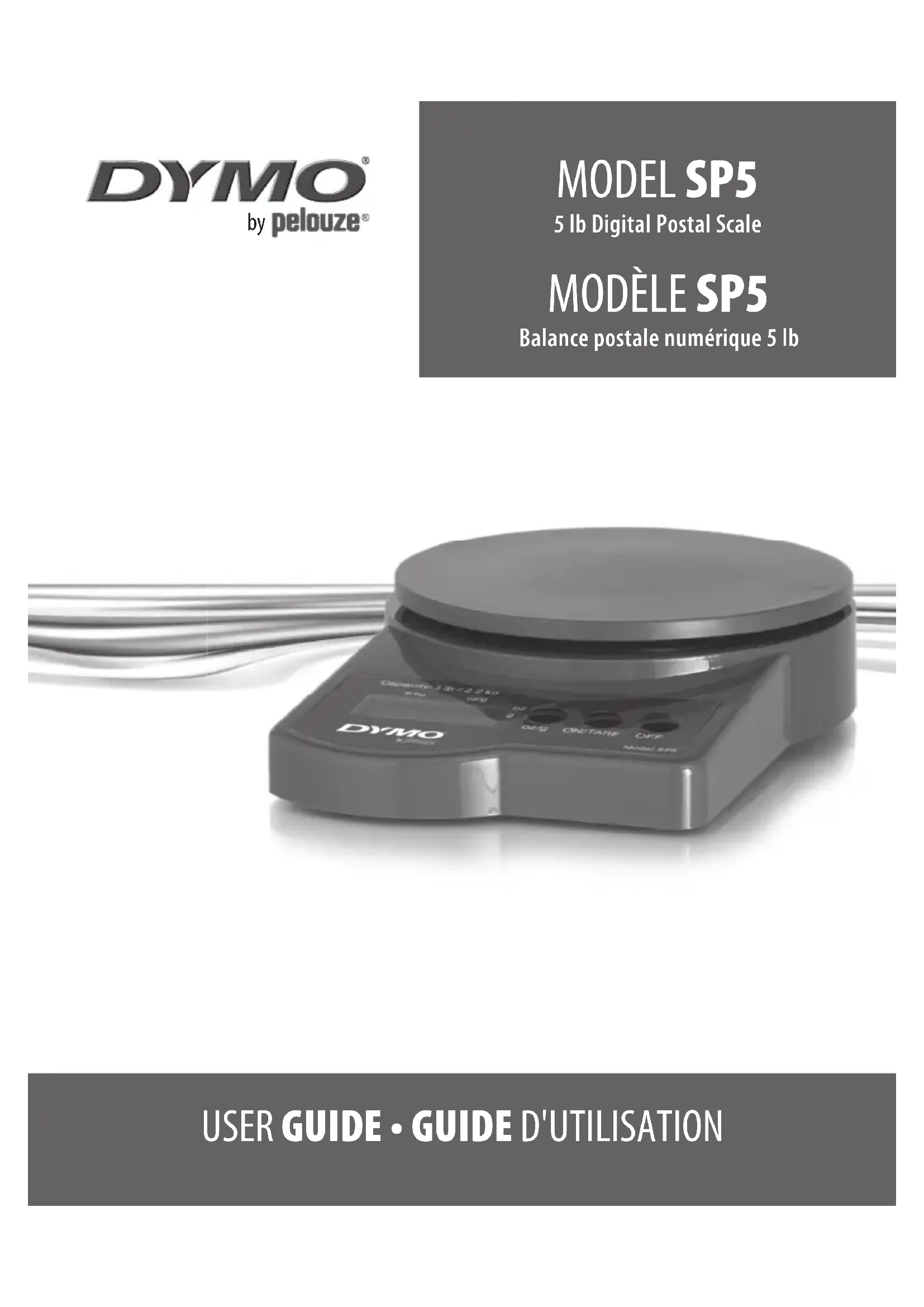 OUT2 is displayed The load cell in the scale is damaged and the scale must be replaced. Contact Technical Support for assistance.5 Balance postale numérique DYMO by Pelouze Votre nouvelle balance postale numérique permet de peser des objets d’un poids allant jusqu’à cinq livres (2,2 kg), avec des incréments de 0,1 once (1 g). Ce guide d’utilisation vous fournit des renseignements sur le mode d’emploi de la balance. Déballage de la balance La balance postale est expédiée avec un anneau protecteur placé sous le plateau. Avant de l’utiliser, vous devez retirer cet anneau. Pour déballer la balance