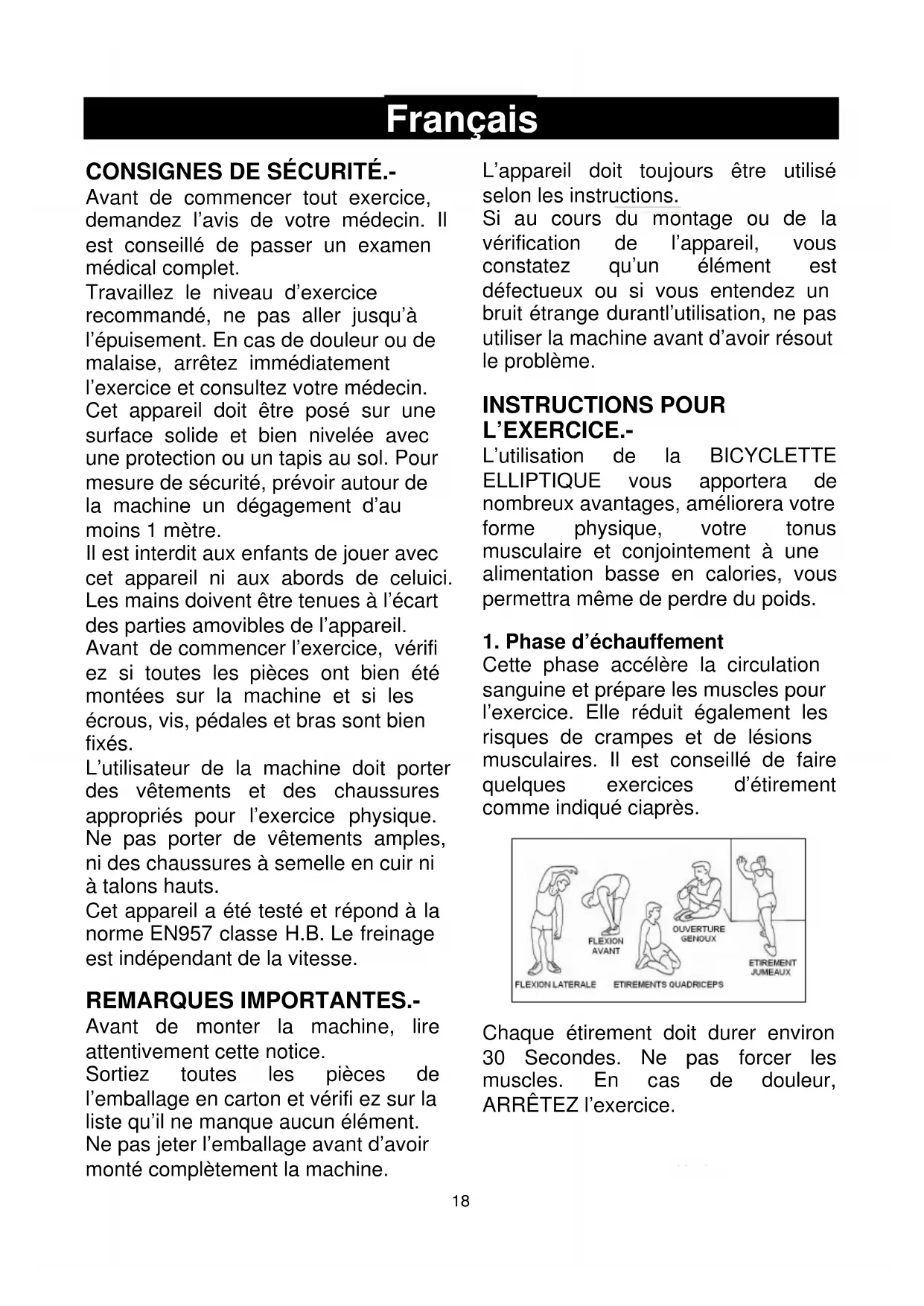 Avant de commencer tout exercice, demandez l’avis de votre médecin. Il est conseillé de passer un examen médical complet. Travaillez le niveau d’exercice recommandé, ne pas aller jusqu’à l’épuisement. En cas de douleur ou de malaise, arrêtez immédiatement l’exercice et consultez votre médecin. Cet appareil doit être posé sur une surface solide et bien nivelée avec une protection ou un tapis au sol. Pour mesure de sécurité, prévoir autour de la machine un dégagement d’au moins 1 mètre. Il est interdit aux enfants de jouer avec cet appareil ni aux abords de celuici. Les mains doivent être tenues à l’écart des parties amovibles de l’appareil. Avant de commencer l’exercice, vérifi ez si toutes les pièces ont bien été montées sur la machine et si les écrous, vis, pédales et bras sont bien fixés. L’utilisateur de la machine doit porter des vêtements et des chaussures appropriés pour l’exercice physique. Ne pas porter de vêtements amples, ni des chaussures à semelle en cuir ni à talons hauts. Cet appareil a été testé et répond à la norme EN957 classe H.B. Le freinage est indépendant de la vitesse. REMARQUES IMPORTANTES.- Avant de monter la machine, lire attentivement cette notice. Sortiez toutes les pièces de l’emballage en carton et vérifi ez sur la liste qu’il ne manque aucun élément. Ne pas jeter l’emballage avant d’avoir monté complètement la machine. L’appareil doit toujours être utilisé selon les instructions. Si au cours du montage ou de la vérification de l’appareil, vous constatez qu’un élément est défectueux ou si vous entendez un bruit étrange durantl’utilisation, ne pas utiliser la machine avant d’avoir résout le problème. INSTRUCTIONS POUR L’EXERCICE.- L’utilisation de la BICYCLETTE ELLIPTIQUE vous apportera de nombreux avantages, améliorera votre forme physique, votre tonus musculaire et conjointement à une alimentation basse en calories, vous permettra même de perdre du poids.