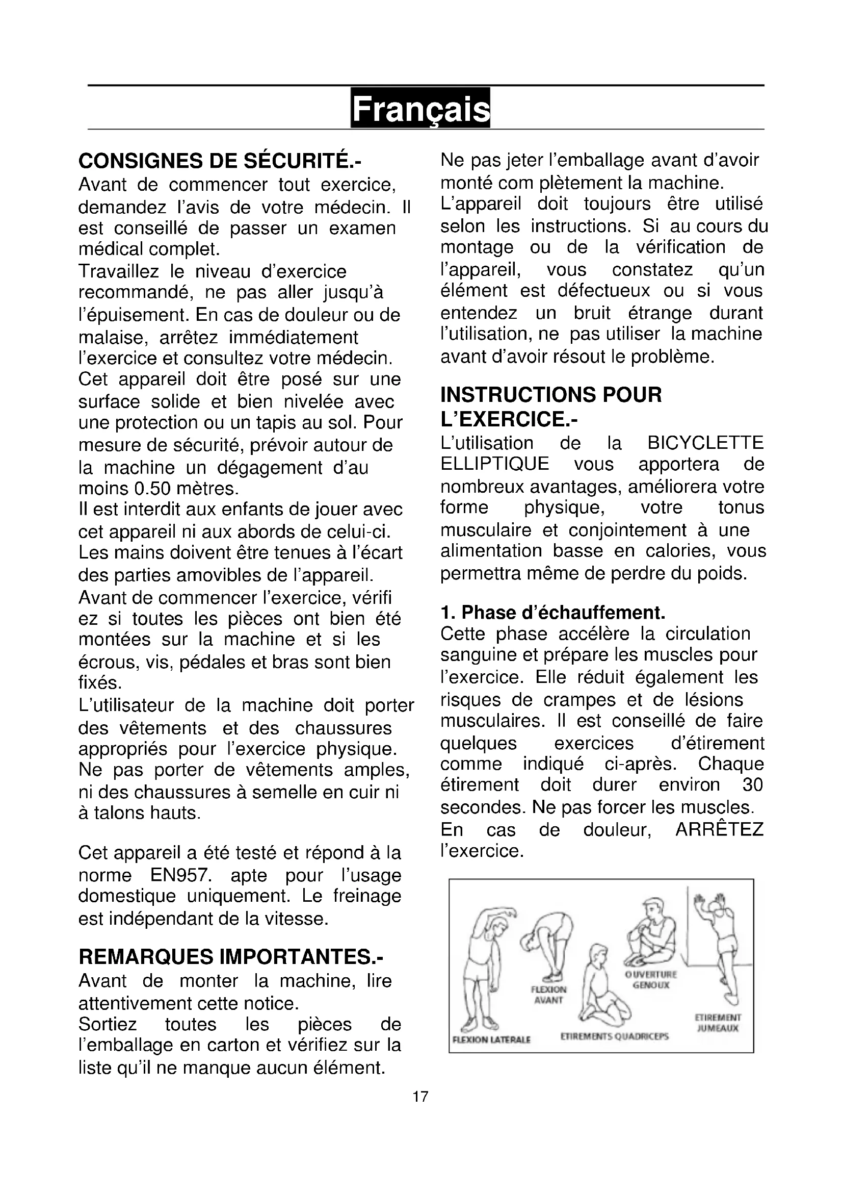 Avant de commencer tout exercice, demandez l’avis de votre médecin. Il est conseillé de passer un examen médical complet. Travaillez le niveau d’exercice recommandé, ne pas aller jusqu’à l’épuisement. En cas de douleur ou de malaise, arrêtez immédiatement l’exercice et consultez votre médecin. Cet appareil doit être posé sur une surface solide et bien nivelée avec une protection ou un tapis au sol. Pour mesure de sécurité, prévoir autour de la machine un dégagement d’au moins 0.50 mètres. Il est interdit aux enfants de jouer avec cet appareil ni aux abords de celui-ci. Les mains doivent être tenues à l’écart des parties amovibles de l’appareil. Avant de commencer l’exercice, vérifi ez si toutes les pièces ont bien été montées sur la machine et si les écrous, vis, pédales et bras sont bien fixés. L’utilisateur de la machine doit porter des vêtements et des chaussures appropriés pour l’exercice physique. Ne pas porter de vêtements amples, ni des chaussures à semelle en cuir ni à talons hauts. Cet appareil a été testé et répond à la norme EN957. apte pour l’usage domestique uniquement. Le freinage est indépendant de la vitesse. REMARQUES IMPORTANTES.- Avant de monter la machine, lire attentivement cette notice. Sortiez toutes les pièces de l’emballage en carton et vérifiez sur la liste qu’il ne manque aucun élément. Ne pas jeter l’emballage avant d’avoir monté com plètement la machine. L’appareil doit toujours être utilisé selon les instructions. Si au cours du montage ou de la vérification de l’appareil, vous constatez qu’un élément est défectueux ou si vous entendez un bruit étrange durant l’utilisation, ne pas utiliser la machine avant d’avoir résout le problème. INSTRUCTIONS POUR L’EXERCICE.- L’utilisation de la BICYCLETTE ELLIPTIQUE vous apportera de nombreux avantages, améliorera votre forme physique, votre tonus musculaire et conjointement à une alimentation basse en calories, vous permettra même de perdre du poids.
