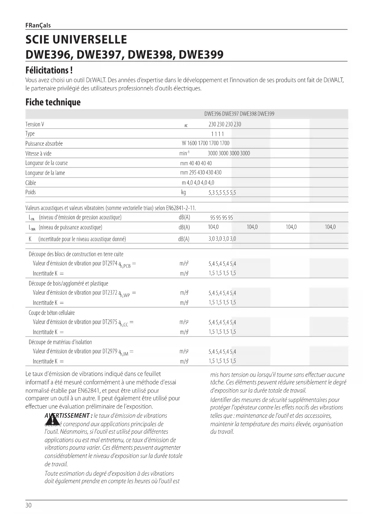 Félicitations ! Vous avez choisi un outil DeWALT. Des années d’expertise dans le développement et l’innovation de ses produits ont fait de DeWALT, le partenaire privilégié des utilisateurs professionnels d’outilsélectriques. Fiche technique
