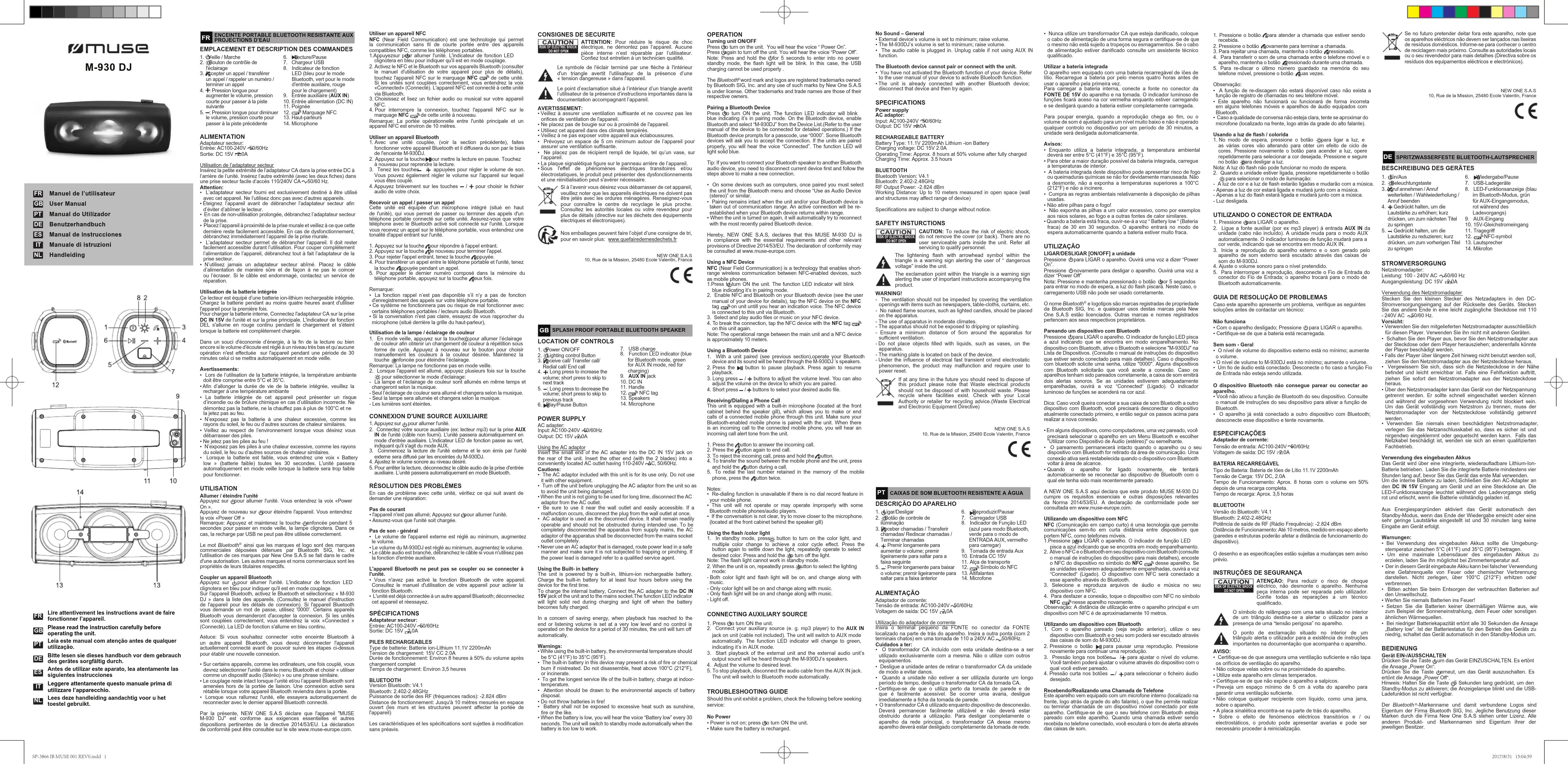 audio de votre choix. Recevoir un appel / passer un appelCette unité est équipée d'un microphone intégré (situé en haut de l'unité), qui vous permet de passer ou terminer des appels d'un téléphone portable connecté sur cette unité. Assurez-vous que votre téléphone avec le Bluetooth activé soit connecté sur l'unité. Lorsque vous recevez un appel sur le téléphone portable, vous entendrez une tonalité d'appel entrant sur l'unité.1. Appuyez sur la touche pour répondre à l'appel entrant.2. Appuyez sur la touche de nouveau pour terminer l'appel.3. Pour rejeter l'appel entrant, tenez la touche appuyée.4. Pour transférer un appel entre le téléphone portable et l'unité, tenez la touche appuyée pendant un appel.5. Pour appeler le dernier numéro composé dans la mémoire du téléphone portable, appuyez sur la touche deux fois.Remarque:• La fonction rappel n’est pas disponible s’il n’y a pas de fonction d'enregistrement des appels sur votre téléphone portable.• Ce système ne fonctionnera pas ou risque de mal fonctionner avec certains téléphones portables / lecteurs audio Bluetooth.• Si la conversation n'est pas claire, essayez de vous rapprocher du microphone (situé derrière la grille du haut-parleur),Utilisation de la lampe / éclairage de couleur1. En mode veille, appuyez sur la touche pour allumer l’éclairage de couleur an obtenir un changement de couleur à répétition sous forme de cycle. Appuyez à nouveau sur le bouton pour choisir manuellement les couleurs à la couleur désirée. Maintenez la touche enfoncée pour éteindre l’éclairage.Remarque: La lampe ne fonctionne pas en mode veille.2. Lorsque l'appareil est allumé, appuyez plusieurs fois sur la touche pour sélectionner le mode d'éclairage:- La lampe et l’éclairage de couleur sont allumés en même temps et changeront selon la musique.- Seul l’éclairage de couleur sera allumé et changera selon la musique.- Seul la lampe sera allumée et changera selon la musique.- Les lumières sont éteintes.Allumer / éteindre l'unitéAppuyez sur pour allumer l'unité. Vous entendrez la voix «Power On ». Appuyez de nouveau sur pour éteindre l'appareil. Vous entendrez la voix «Power O »Remarque: Appuyez et maintenez la touche enfoncée pendant 5 secondes pour passer en mode veille, la lampe clignotera. Dans ce cas, la recharge par USB ne peut pas être utilisée correctement.Le mot Bluetooth ainsi que les marques et logo sont des marques commerciales déposées détenues par Bluetooth SIG, Inc. et l'utilisation de ces marques par New One S.A.S se fait dans le cadre d'une autorisation. Les autres marques et noms commerciaux sont les propriétés de leurs titulaires respectifs.Coupler un appareil BluetoothAppuyez sur pour allumer l'unité. L'indicateur de fonction LED clignotera en bleu pour indiquer qu'il est en mode couplage.Sur l'appareil Bluetooth, activez le Bluetooth et sélectionnez « M-930 DJ » dans la liste des appareils. (Consultez le manuel d'instruction de l'appareil pour les détails de connexion). Si l'appareil Bluetooth vous demande un mot de passe, utilisez '0000'. Certains appareils Bluetooth vous demanderont d'accepter la connexion. Si les unités sont couplées correctement, vous entendrez la voix «Connected » (Connecté). La LED de fonction s'allume en bleu continu.Astuce: Si vous souhaitez connecter votre enceinte Bluetooth à un autre appareil Bluetooth, vous devez déconnecter l'appareil actuellement connecté avant de pouvoir suivre les étapes ci-dessus pour établir une nouvelle connexion.• Sur certains appareils, comme les ordinateurs, une fois couplé, vous devrez sélectionner l'unité dans le menu Bluetooth et choisir « utiliser comme un dispositif audio (Stéréo) » ou une phrase similaire. • Le couplage reste intact lorsque l’unité et/ou l’appareil Bluetooth sont amenées hors de la portée de liaison. Une connexion active sera rétablie lorsque votre appareil Bluetooth reviendra dans la portée.• Lorsque vous rallumez l'unité, elle essayera automatiquement de reconnecter avec le dernier appareil Bluetooth connecté. Par la présente, NEW ONE S.A.S déclare que l'appareil "MUSE M-930 DJ" est conforme aux exigences essentielles et autres dispositions pertinentes de la directive 2014/53/EU. La déclaration de conformité peut être consultée sur le site www.muse-europe.com.Turning unit ON/OFFPress to turn on the unit. You will hear the voice “ Power On”. Press again to turn o the unit. You will hear the voice “Power O”.Note: Press and hold the for 5 seconds to enter into no power standby mode, the ash light will be blink. In this case, the USB charging cannot be used properly .The Bluetooth word mark and logos are registered trademarks owned by Bluetooth SIG, Inc. and any use of such marks by New One S.A.S is under license. Other trademarks and trade names are those of their respective owners.Pairing a Bluetooth DevicePress to turn ON the unit. The function LED indicator will blink blue indicating it’s in pairing mode. On the Bluetooth device, enable Bluetooth and select “M-930DJ” from the Device List.(Refer to the user manual of the device to be connected for detailed operations.) If the Bluetooth device prompts for a passcode, use “0000”. Some Bluetooth devices will ask you to accept the connection. If the units are paired properly, you will hear the voice “Connected”. The function LED will light solid blue.Tip: If you want to connect your Bluetooth speaker to another Bluetooth audio device, you need to disconnect current device rst and follow the steps above to make a new connection.• On some devices such as computers, once paired you must select the unit from the Bluetooth menu and choose “Use as Audio Device (stereo)” or similar. • Pairing remains intact when the unit and/or your Bluetooth device is taken out of communication range. An active connection will be re-established when your Bluetooth device