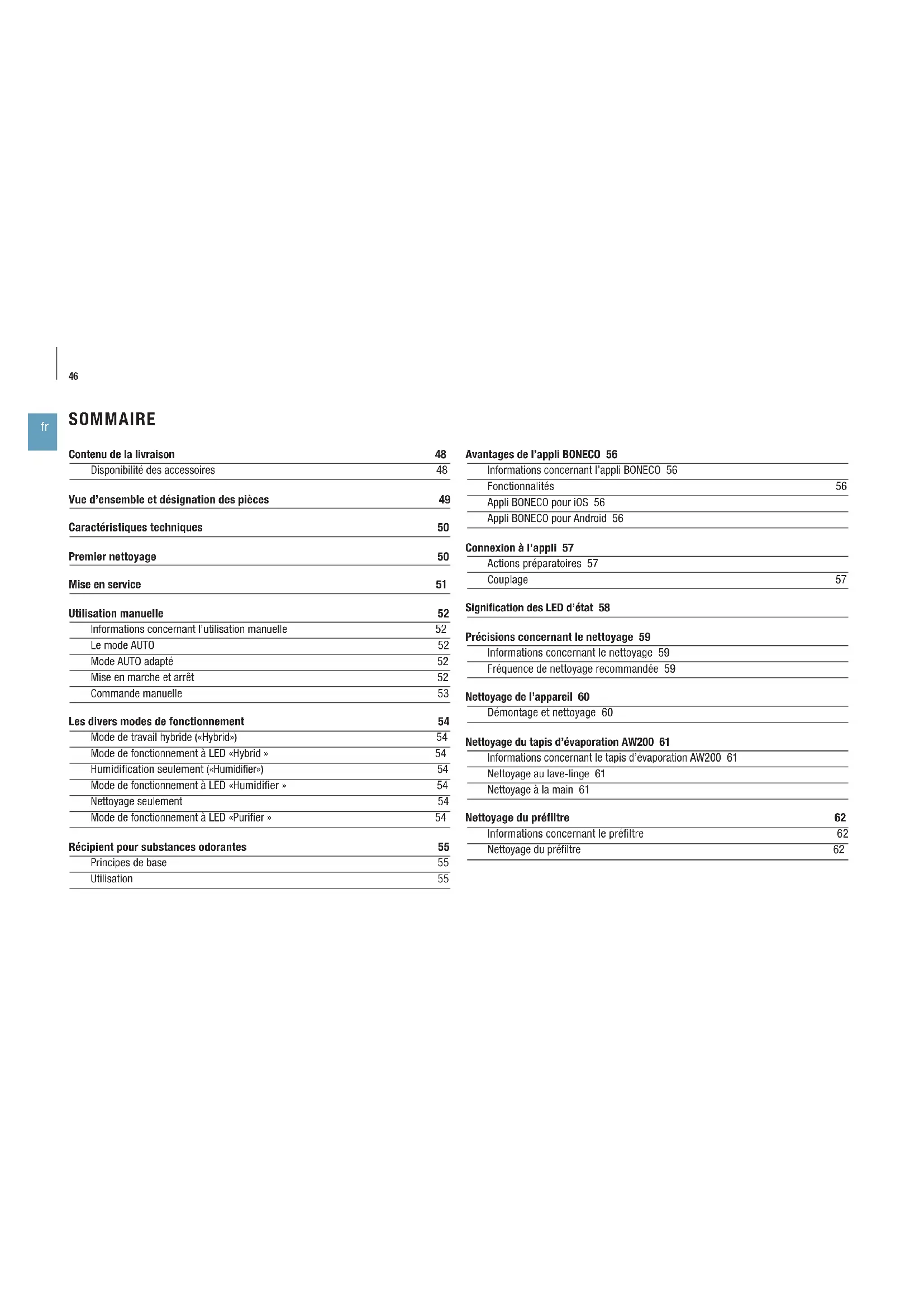 Avantages de l’appli BONECO 56 Informations concernant l’appli BONECO 56 Fonctionnalités 56 Appli BONECO pour iOS 56 Appli BONECO pour Android 56 Connexion à l’appli 57 Actions préparatoires 57 Couplage 57 Signification des LED d’état 58 Précisions concernant le nettoyage 59 Informations concernant le nettoyage 59 Fréquence de nettoyage recommandée 59 Nettoyage de l’appareil 60 Démontage et nettoyage 60 Nettoyage du tapis d’évaporation AW200 61 Informations concernant le tapis d’évaporation AW200 61 Nettoyage au lave-linge 61 Nettoyage à la main 61 Nettoyage du préfiltre 62 Informations concernant le préfiltre 62 Nettoyage du préfiltre 62 Contenu de la livraison 48 Disponibilité des accessoires 48 Vue d’ensemble et désignation des pièces 49 Caractéristiques techniques 50 Premier nettoyage 50 Mise en service 51 Utilisation manuelle 52 Informations concernant l’utilisation manuelle 52 Le mode AUTO 52 Mode AUTO adapté 52 Mise en marche et arrêt 52 Commande manuelle 53 Les divers modes de fonctionnement 54 Mode de travail hybride («Hybrid») 54 Mode de fonctionnement à LED «Hybrid » 54 Humidification seulement («Humidifier») 54 Mode de fonctionnement à LED «Humidifier » 54 Nettoyage seulement 54 Mode de fonctionnement à LED «Purifier » 54 Récipient pour substances odorantes 55 Principes de base 55 Utilisation 55 SOMMAIRERemplacement des accessoires 63 Remplacement du bâtonnet Ionic Silver Stick