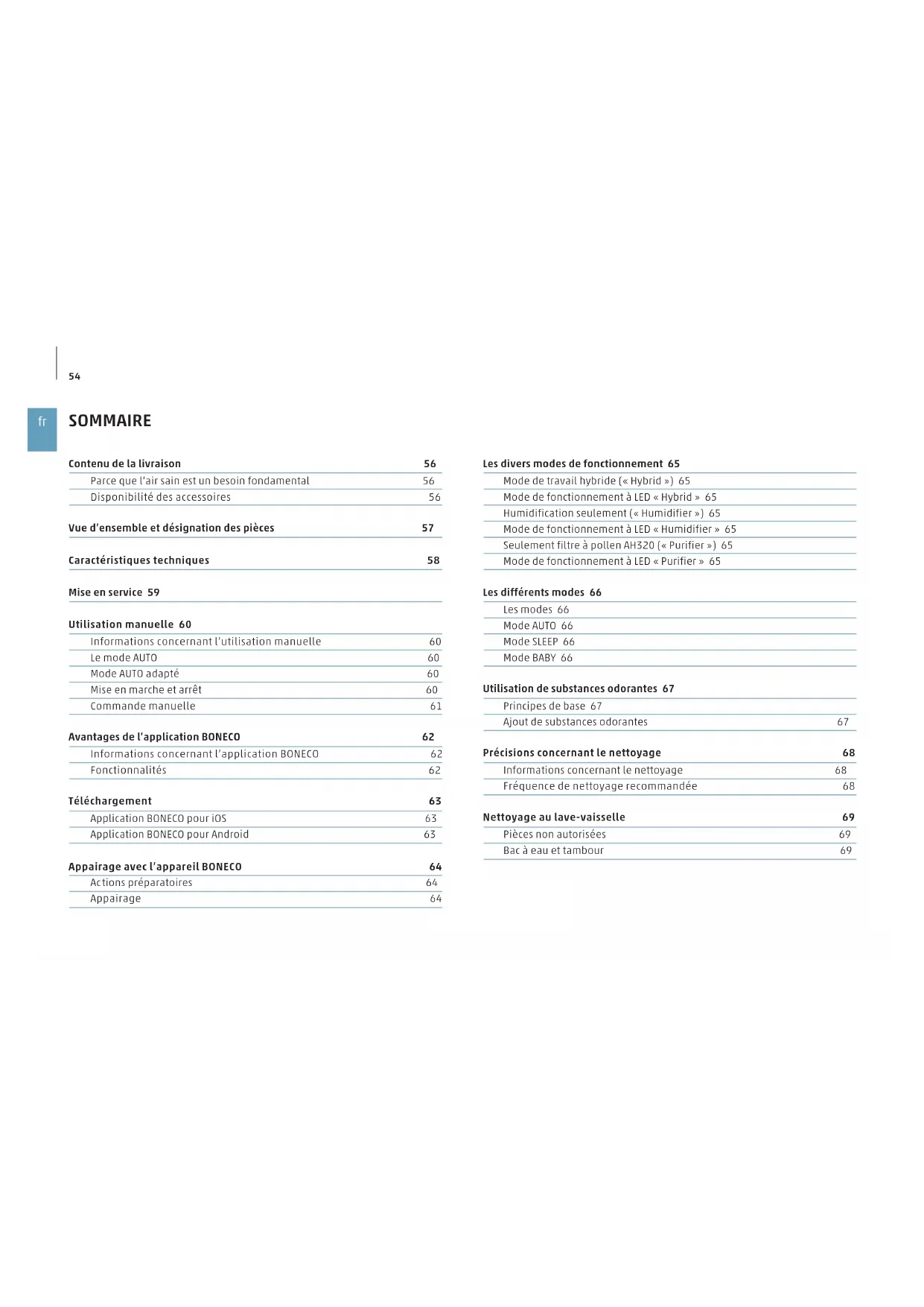 SOMMAIRE Les divers modes de fonctionnement 65 Mode de travail hybride («Hybrid») 65 Mode de fonctionnement à LED «Hybrid» 65 Humidification seulement («Humidifier») 65 Mode de fonctionnement à LED «Humidifier» 65 Seulement filtre à pollen AH320 («Purifier») 65 Mode de fonctionnement à LED «Purifier» 65 Les différents modes 66 Les modes 66 Mode AUTO 66 Mode SLEEP 66 Mode BABY 66 Utilisation de substances odorantes 67 Principes de base 67 Ajout de substances odorantes 67 Précisions concernant le nettoyage 68 Informations concernant le nettoyage 68 Fréquence de nettoyage recommandée 68 Nettoyage au lave-vaisselle 69 Pièces non autorisées 69 Bac à eau et tambour 69 Contenu de la livraison 56 Parce que l’air sain est un besoin fondamental 56 Disponibilité des accessoires 56 Vue d’ensemble et désignation des pièces 57 Caractéristiques techniques 58 Mise en service 59 Utilisation manuelle 60 Informations concernant l’utilisation manuelle 60 Le mode AUTO 60 Mode AUTO adapté 60 Mise en marche et arrêt 60 Commande manuelle 61 Avantages de l’application BONECO 62 Informations concernant l’application BONECO 62 Fonctionnalités 62 Téléchargement 63 Application BONECO pour iOS 63 Application BONECO pour Android 63 Appairage avec l’appareil BONECO 64 Actions préparatoires 64 Appairage 6455