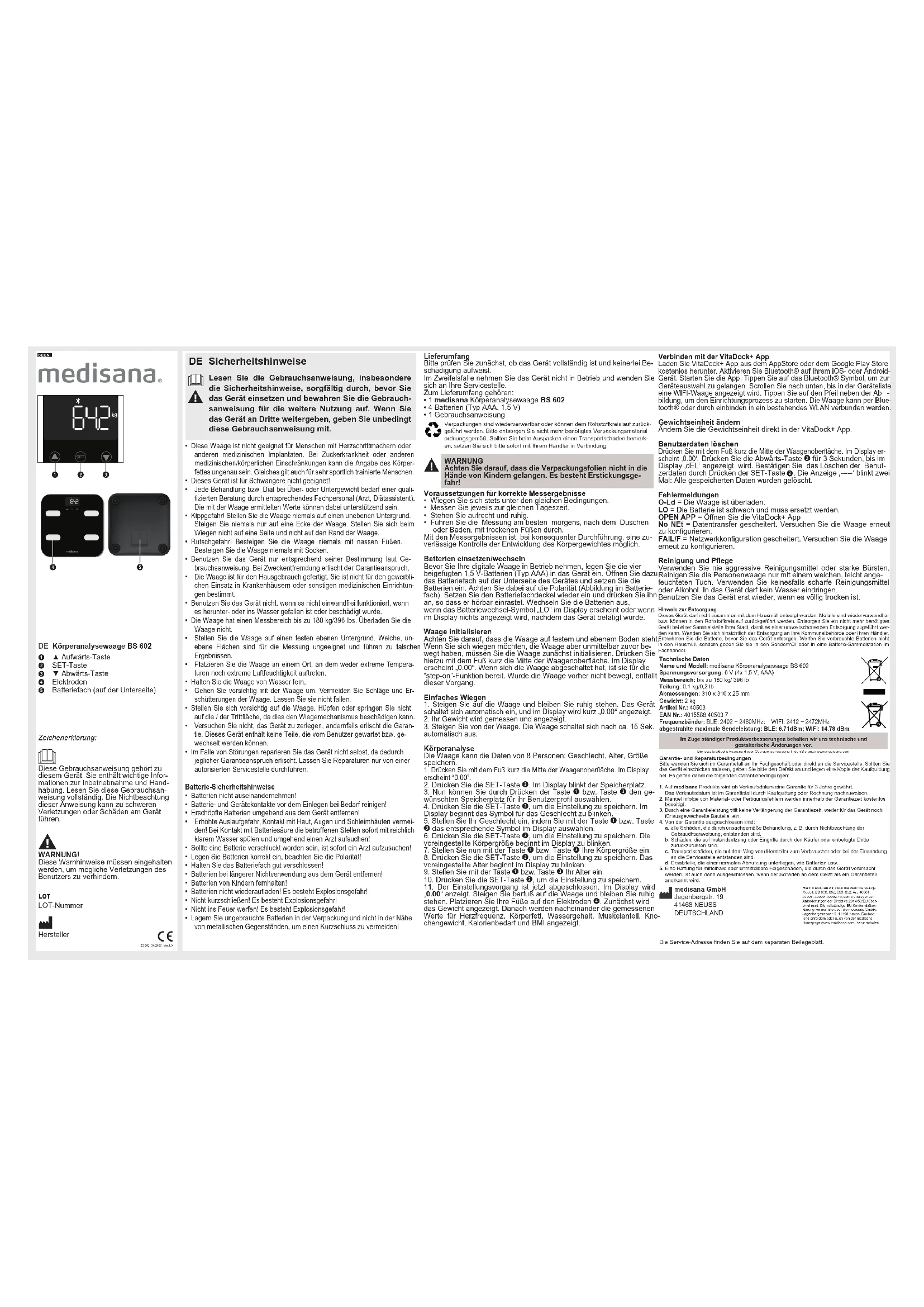 Compartiment à piles (sur la face inférieure) Explication des symboles : Ce mode d’emploi fait partie intégrante de cet appareil. Il contient d’importantes instructions pour la mise en service et l’utilisation. Lisez ce mode d’emploi dans son intégralité. Le non-respect de ces instructions peut entraîner des blessures graves ou risque d’endommager l’appa- reil. AVERTISSEMENT ! Ces avertissements doivent être respec- tés pour éviter d’éventuelles blessures à l’utilisateur. Numéro de LOT Fabricant BS 602 04/2020 Ver.1.0Caractéristiques techniquesNom et modèle : Balance impédancemètre BS 602 medisanaAlimentation électrique : 6 V (4 x 1,5 V, AAA)Plage de mesure : jusqu’à 180 kg / 396 lb Répartition : 0,1 kg/0,2 lbDimensions : 310 x 310 x 25 mm Poids : 2 kgN° d’article : 40503N° EAN : 4015588 40503 7Bandes de fréquences : BLE : 2402 ~ 2480MHz ; WIFI : 2412 ~ 2472MHzPuissance d’émission maximale rayonnée : BLE : 6,71dBm ; WIFI : 14,78 dBm Conditions requises pour des résultats de mesure corrects