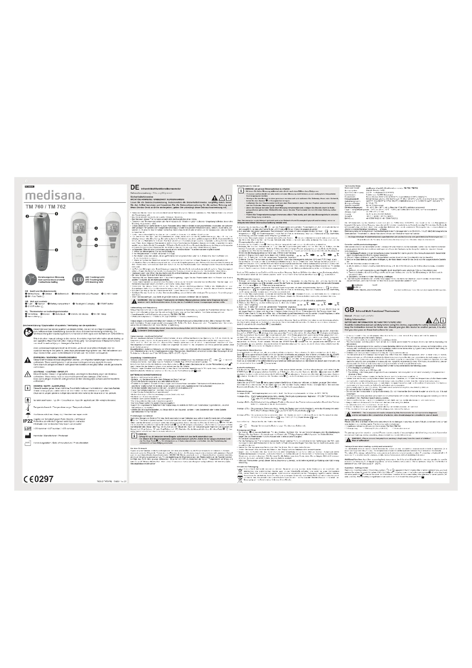 a. alle schades die zijn ontstaan door onjuist gebruik, bijv. door het niet naleven van de gebruiksaanwijzing. b. schade die het gevolg is van een reparatie of interventie door de koper of een onbevoegde derde. c. transportschades die zijn ontstaan op weg van de fabrikant naar de gebruiker of bij het opsturen naar de servicedienst. d. onderdelen die normale slijtage vertonen. 5. Een aansprakelijkheid voor directe of indirecte gevolgschade die is veroorzaakt door het apparaat is ook dan uitgesloten, als er schade aan het product wordt erkend als garantie. medisana GmbH Carl-Schurz-Str. 2 41460 NEUSS, DUITSLAND Het service-adres vindt u op het apart bijgevoegde blad.0297 Ce mode d’emploi fait partie intégrante de cet article. Il contient d’importantes instructions pour la mise en service et l’utilisation. Lisez ce mode d’emploi dans son intégralité. Le non-respect de ces instructions peut entraîner des blessures graves ou risque d’endommager l’article. Este manual de instrucciones forma parte de este artículo. Contiene información importante sobre su estructura y manipulación. Lea íntegramente este manual de instrucciones. La inobservancia de las instrucciones puede provocar lesiones graves o daños en el artículo. Le presenti istruzioni per l’uso sono parte integrante dell’apparecchio. Esse contengono informa-zioni importanti relative alla struttura e alla gestione dell’apparecchio. Leggere tutte le istruzioni per l’uso. Il mancato rispetto delle presenti istruzioni può comportare gravi lesioni o danni all’apparecchio. AVERTISSEMENT / ADVERTENCIA / AVVERTENZACes avertissements doivent être respectés pour éviter d’éventuelles blessures à l’utilisateur. Se deben respetar las indicaciones de seguridad para evitar posibles lesiones del usuario. È necessario rispettare le presenti avvertenze per evitare possibili lesioni dell’utente. ATTENTION / ATENCIÓN / ATTENZIONE Ces instructions doivent être respectées an d’éviter d’éventuels dommages à l’appareil. Se deben respetar estas indicaciones para evitar posibles daños en el aparato.È necessario rispettare le presenti indicazioni per evitare di danneggiare l’apparecchio. REMARQUE / NOTA / NOTACes instructions vous procurent des informations supplémentaires utiles sur l’installation ou le fonctionnement. Estas indicaciones le proporcionan información adicional sobre la instalación y el funcionamiento. Queste note contengono ulteriori utili informazioni per l’installazione o l’utilizzo. Classication de l’appareil : Type BF / Clasicación del aparato: tipo BF / Classicazione dell’apparecchio: Tipo BFPlage de température / Rango de temperaturas / Gamma di temperatura Protéger de l’humidité / Proteger de la humedad / Proteggere dall’umidità Indice de protection contre les corps solides et l’eauInformación del tipo de protección contra objetos sólidos y aguaIndicazione del tipo di protezione contro solidi e acqua Numéro de LOT / Número de lote / Numero LOT Fabricant / Fabricante / ProduttoreDate de fabrication / Fecha de fabricación / Data di fabbricazione FR Thermomètre infrarouge multifonctions Veuillez lire attentivement le mode d’emploi ! Consignes de sécuritéREMARQUES IMPORTANTES ! À CONSERVER PRÉCIEUSEMENT ! Lisez attentivement le mode d’emploi, en particulier les consignes de sécurité, avant d’utiliser l’appareil et conservez ce mode d’emploi pour une utilisation ultérieure. Si vous conez l’appareil à un tiers, veuillez impérativement joindre ce mode d’emploi.Légende des symboles / Leyenda / Spiegazione dei simboli: TM 760 / TM 762 IP22 Données techniquesNom et modèle :Système d’achage :Alimentation électrique :Durée de vie :Plage de mesure :Précision de mesure :(Mesures en laboratoire) Résolution de l’achage :Capacité de stockage :Conditions de fonctionnement :Conditions de stockage et de transport :Dimensions :Poids :N° d’article :Code EAN : Le marquage CE de l’appareil fait référence à la directive européenne 93/42/CEE. L’appareil est conçu pour un usage do- mestique. Pour un usage professionnel, un contrôle métrologique doit être eectué une fois par an. Le contrôle est payant et peut être eectué par une instance compétente ou par des services de maintenance agréés, conformément à « l’ordonnance relative aux utilisateurs de dispositifs médicaux ». Compatibilité électromagnétique : L’appareil est conforme aux exigences de la norme EN 60601-1/-1-2 relative à la compatibi- lité électromagnétique. Les détails concernant ces données de mesure gurent dans la notice complémentaire.
