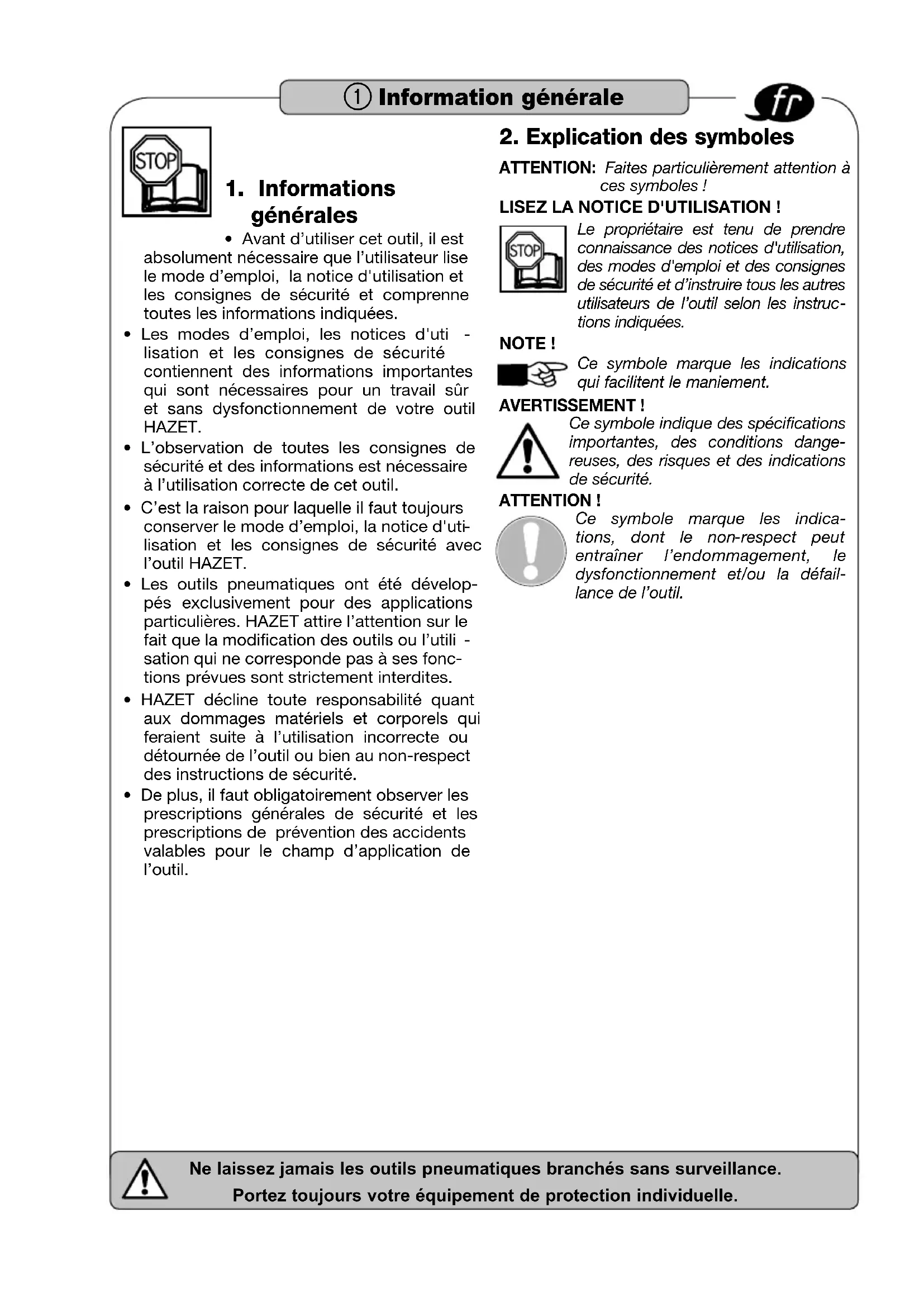 ATTENTION: Faites particulièrement attention à ces symboles! LISEZ LA NOTICE D'UTILISATION ! Le propriétaire est tenu de prendre connaissance des notices d'utilisation, des modes d'emploi et des consignes de sécurité et d’instruire tous les autres utilisateurs de l’outil selon les instruc