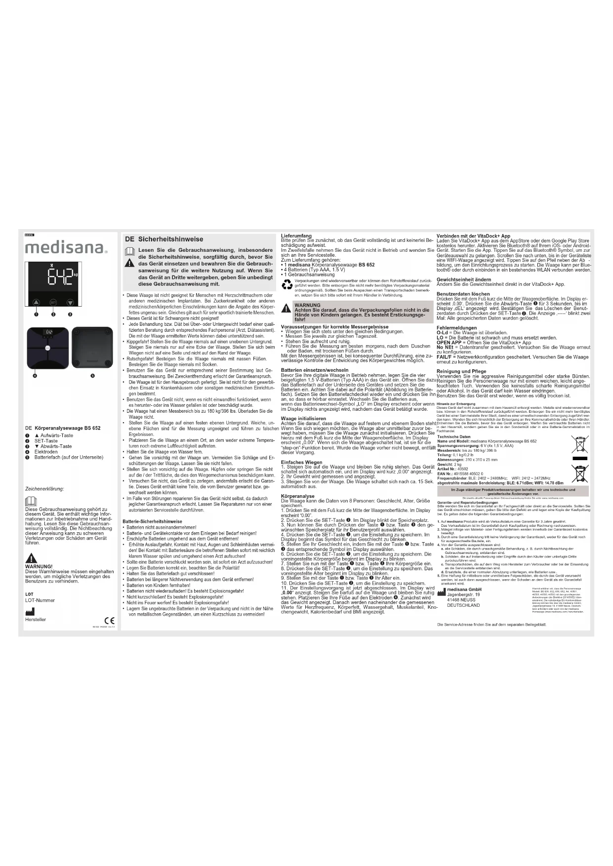 Compartiment à piles (sur la face inférieure) Explication des symboles : Ce mode d’emploi fait partie intégrante de cet appareil. Il contient d’importantes instructions pour la mise en service et l’utilisation. Lisez ce mode d’emploi dans son intégralité. Le non-respect de ces instructions peut entraîner des blessures graves ou risque d’endommager l’appa- reil. AVERTISSEMENT ! Ces avertissements doivent être respec- tés pour éviter d’éventuelles blessures à l’utilisateur. Numéro de LOT Fabricant BS 652 04/2020 Ver.1.0Caractéristiques techniquesNom et modèle : Balance impédancemètre BS 652 medisanaAlimentation électrique : 6 V (4 x 1,5 V, AAA)Plage de mesure : jusqu’à 180 kg / 396 lb Répartition : 0,1 kg/0,2 lbDimensions : 310 x 310 x 25 mm Poids : 2 kgN° d’article : 40502N° EAN : 4015588 40502 0Bandes de fréquences : BLE : 2402 ~ 2480MHz ; WIFI : 2412 ~ 2472MHzPuissance d’émission maximale rayonnée : BLE : 6,71dBm ; WIFI : 14,78 dBm Conditions requises pour des résultats de mesure corrects