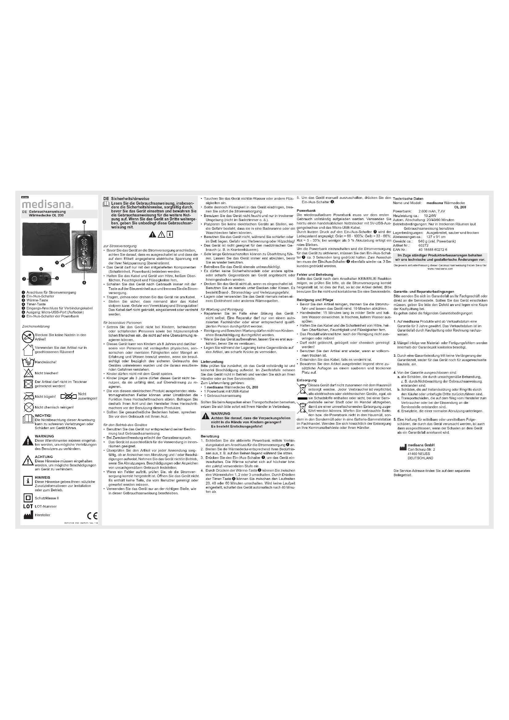 - Gardez l’article déplié dans un endroit propre et sec, sans autre condition. Élimination Cet appareil ne doit pas être éliminé avec les ordures ménagères. Chaque utilisateur est tenu de rapporter tous les appareils électriques ou électroniques, qu’ils contiennent ou non des substances nocives, à un point de collecte dans sa ville ou dans le commerce, an qu’ils puissent être éliminés de manière écolo- gique. Ne mettez pas les piles usagées (ou la batterie externes) à la poubelle, placez-les avec les déchets spéciaux ou déposez-les dans un point de collecte des piles usagées dans les commerces spécialisés. Adressez-vous aux autorités locales ou à votre revendeur pour la mise au rebut. Caractéristiques techniques Nom et modèle : Couverture chauante medisana OL 200 Batterie externe : 2.600 mAh, 7,4V Puissance de chauage : 19,24W Arrêt automatique : 20/40/60 minutes Conditions d’utilisation : Utiliser uniquement dans des pièces sèches, conformément au mode d’emploi Conditions de stockage : Étendu, propre et sec Dimensions env. : 127 x 91 cm Poids env. : 940 g (avec batterie externe) Article n° : 60272 EAN n° : 40 15588 60272 6 Vous pouvez consulter la version actuelle de ce mode d’emploi à l’adresse suivante : www.medisana.com Par souci d’amélioration constante de nos produits, nous nous réservons le droit d’eectuer des modica- tions techniques et de conception. Conditions de garantie et de réparation En cas de réclamation au titre de la garantie, veuillez vous adresser directement au commerce spécialisé ou au service à la clientèle. Si vous devez retourner l’appareil, veuillez indiquer le défaut et joindre une copie de la quittance d’achat. Les conditions de garantie suivantes s’appliquent :