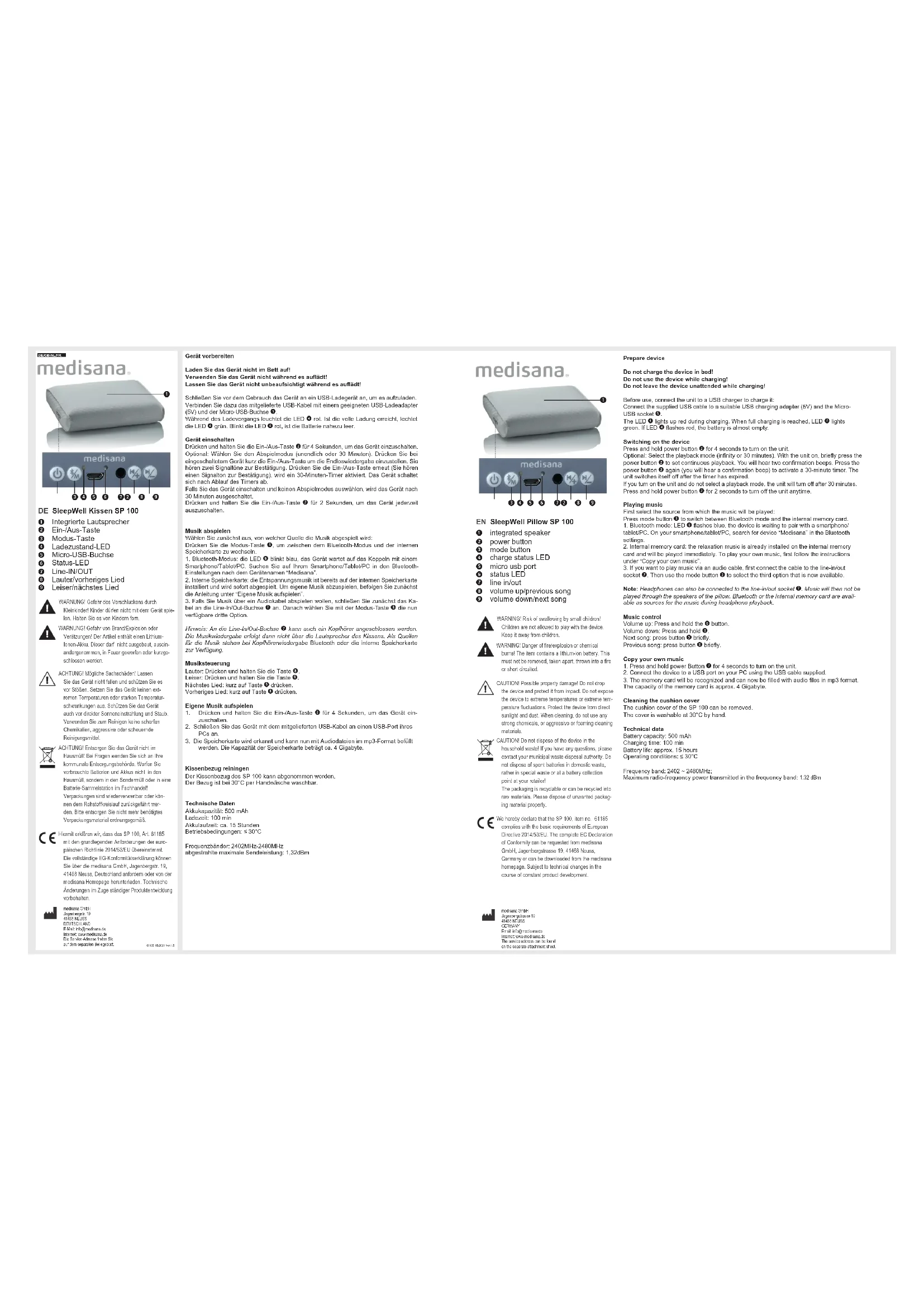 format mp3. La capacité de la carte mémoire est d’environ 4 gigaoctets. Nettoyage de la housse du coussin La housse de coussin du SP 100 peut être enlevée. La housse est lavable à la main à 30°C. Données techniques Capacité de la batterie : 500 mAh Temps de charge : 100 min Autonomie de la batterie : environ 15 heures Conditions d’utilisation : ≤ 30°C Bandes de fréquences : 2402MHz-2480MHz Puissance d’émission maximale rayonnée : 1,32dBm FR Coussin SleepWell SP 100