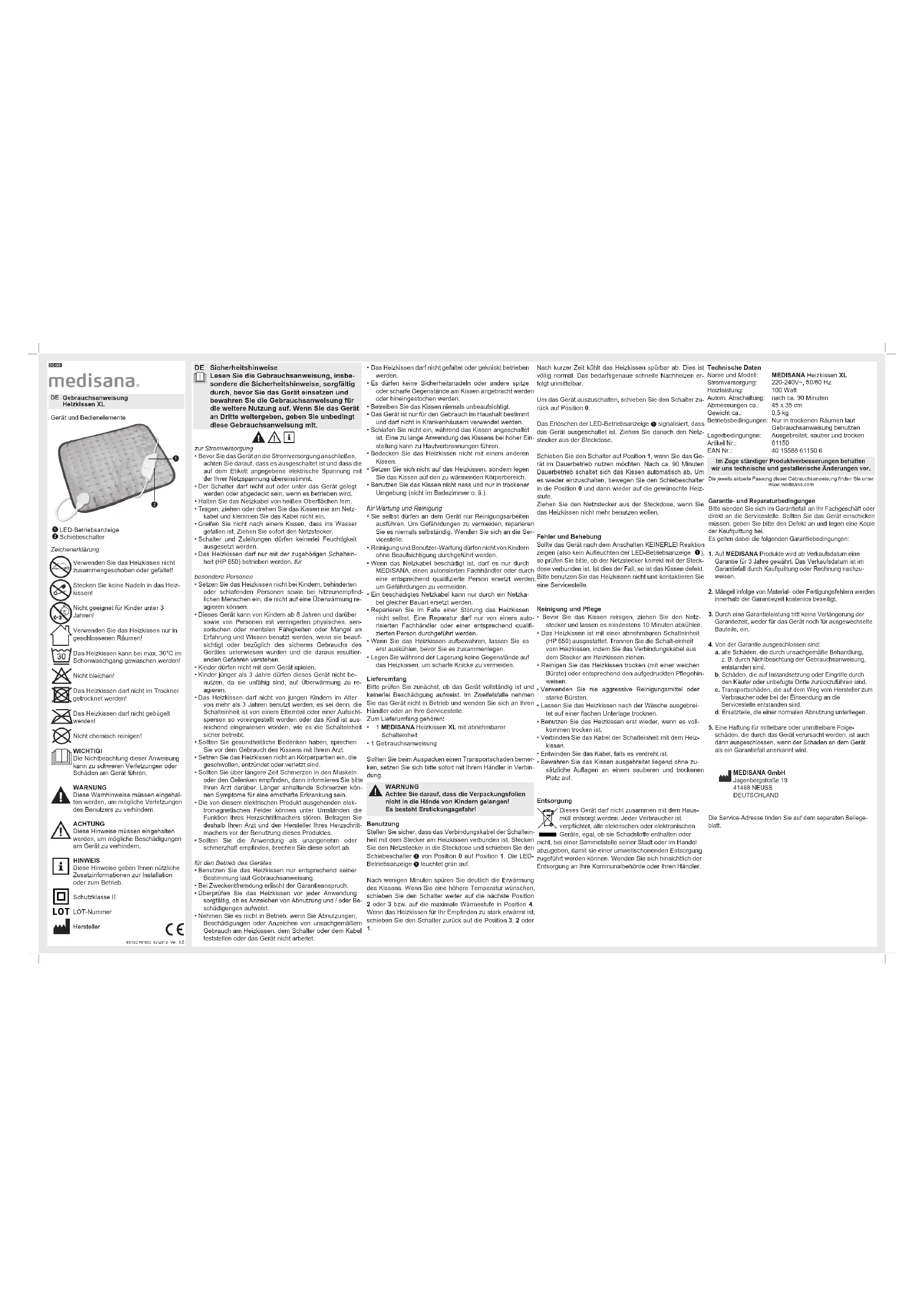 - Rangez le coussin à plat sans rien poser dessus,dans un endroit propre et sec. Élimination de l’appareil Cet appareil ne doit pas être placé avec les ordures ménagères. Chaque consommateur doit ramener les appareils électriques ou électroniques, qu’ils contiennent des substances nocives ou non, à un point de collecte de sa commune ou dans le commerce an de permettre leur élimination écologique. Pour plus de renseignements sur l’élimination des déchets, veuillez vous adresser aux services de votre commune ou bien à votre revendeur. Caractéristiques Nom et modèle : Tension, fréquence : Puissance calorique : Extinction automatique : Dimensions env. : Poids env. : Conditions d’utilisation : Conditions de rangement : N° d’art. : EAN : MEDISANA Coussin chauffant XL 220-240V~, 50/60 Hz 100 watts après 90 min env. 45 x 35 cm 0,5 kg Uniquement utiliser dans des pièces sèches conformément au mode d‘emploi À plat, propre et sec