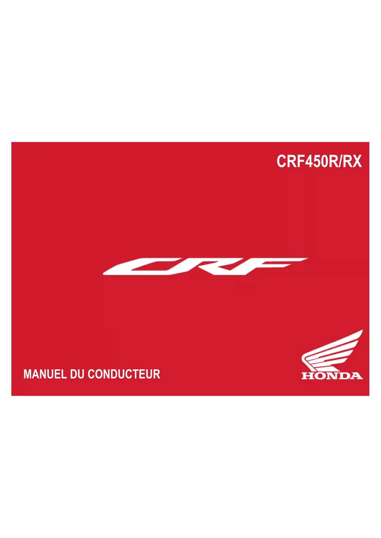 MANUEL DU CONDUCTEURLe présent manuel est une pièce à part entière du véhicule ; il doit rester en permanence sur le véhicule et doit être cédé au nouveau propriétaire en cas de revente. Cette publication inclut les informations les plus récentes disponibles avant l'impression. Honda Motor Co., Ltd. se réserve le droit d'apporter des modifications à tout moment sans préavis et sans obligation quelconque. Aucune partie de cette publication ne peut être reproduite sans autorisation écrite. Il est possible que le véhicule illustré dans le présent manuel d'utilisation ne corresponde pas exactement à votre propre véhicule. © 2022 Honda Motor Co., Ltd.REMARQUE IMPORTANTE CE VEHICULE EST CONÇU ET FABRIQUE POUR LA COMPETITION UNIQUEMENT ET EST VENDU EN L'ETAT, SANS GARANTIE. IL NE REPOND PAS AUX NORMES FEDERALES EN MATIERE DE SECURITE DES VEHICULES A MOTEUR. TOUTE UTILISATION SUR LA VOIE PUBLIQUE (RUES, ROUTES OU AUTOROUTES) EST ILLEGALE. LES LOIS DES ETATS INTERDISENT L'UTILISATION DE CE VEHICULE AUTREMENT QUE DANS DES COURSES OU MANIFESTATIONS DE COMPETITION SUR CIRCUIT FERME ORGANISEES SOUS LES AUSPICES D'UN ORGANISME HABILITE OU AVEC L'AUTORISATION D'UNE AUTORITE ADMINISTRATIVE LOCALE COMPETENTE. S'ASSURER PREALABLEMENT QUE SON UTILISATION EST LEGALE. PILOTE SEULEMENT, PAS DE PASSAGER. Ce véhicule a été conçu et construit pour être utilisé exclusivement comme modèle à usage individuel. La limite de charge du véhicule et la configuration de sa selle ne permettent pas de transporter un passager dans de bonnes conditions de sécurité. LIRE ATTENTIVEMENT CE MANUEL.Bienvenue Nous vous félicitons pour l'achat de votre nouveau véhicule Honda. Vous faites à présent partie de la grande famille de clients satisfaits qui apprécient, aux quatre coins du monde, la qualité apportée par Honda dans chacun de ses produits. Votre véhicule est une moto de course hautes performances utilisant les dernières technologies du motocross/de la course tout-terrain et destinée à une utilisation en compétition par des pilotes expérimentés, uniquement dans des manifestations en circuit fermé autorisées. N'oubliez pas que la course en tout-terrain/ en motocross est un sport exigeant sur le plan physique et qu'un bon véhicule ne suffit pas. Pour bien réussir, votre forme physique doit être excellente et vous devez être un conducteur accompli. C'est en travaillant sur votre condition physique et en vous entraînant fréquemment que vous obtiendrez les meilleurs résultats.Afin de garantir votre sécurité et votre plaisir de piloter, merci de : ● Lire attentivement ce manuel d'utilisation et le carnet de course. ● Suivre toutes les recommandations et procédures contenues dans ce manuel d'utilisation et le carnet de course.