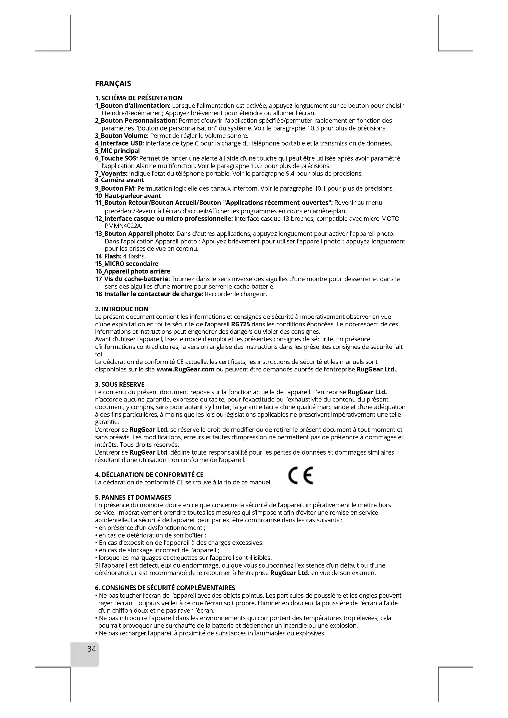 Le présent document contient les informations et consignes de sécurité à impérativement observer en vue d’une exploitation en toute sécurité de l’appareil RG725 dans les conditions énoncées. Le non-respect de ces informations et instructions peut engendrer des dangers ou violer des consignes. Avant d’utiliser l’appareil, lisez le mode d’emploi et les présentes consignes de sécurité. En présence d’informations contradictoires, la version anglaise des instructions dans les présentes consignes de sécurité fait foi. La déclaration de conformité CE actuelle, les certificats, les instructions de sécurité et les manuels sont disponibles sur le site www.RugGear.com ou peuvent être demandés auprès de l’entreprise RugGear Ltd..