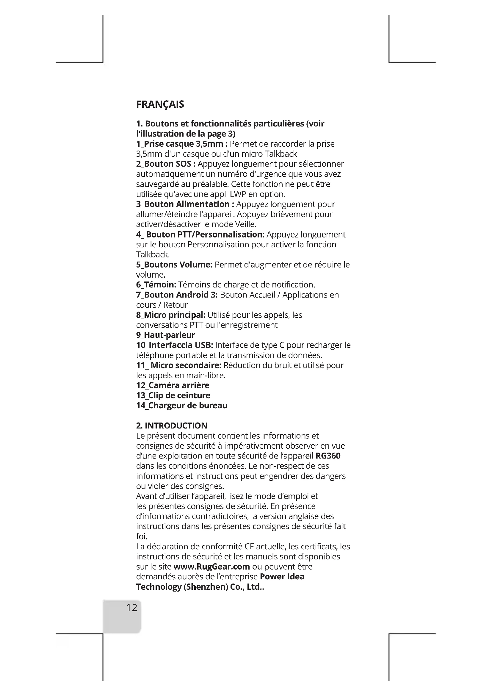 Le présent document contient les informations et consignes de sécurité à impérativement observer en vue d’une exploitation en toute sécurité de l’appareil RG360 dans les conditions énoncées. Le non-respect de ces informations et instructions peut engendrer des dangers ou violer des consignes. Avant d’utiliser l’appareil, lisez le mode d’emploi et les présentes consignes de sécurité. En présence d’informations contradictoires, la version anglaise des instructions dans les présentes consignes de sécurité fait foi. La déclaration de conformité CE actuelle, les certificats, les instructions de sécurité et les manuels sont disponibles sur le site www.RugGear.com ou peuvent être demandés auprès de l’entreprise Power Idea Technology (Shenzhen) Co., Ltd..FR