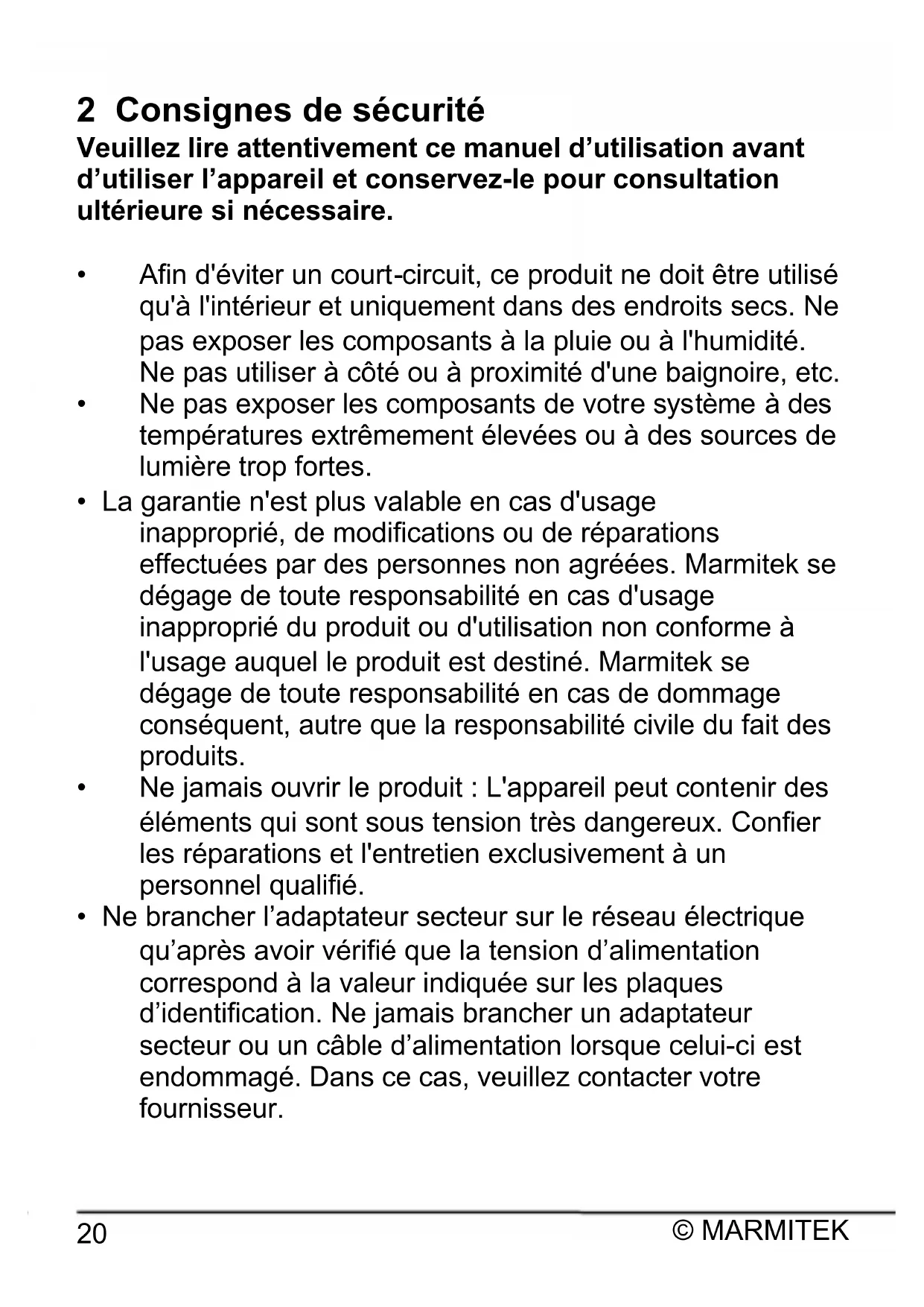 - La garantie n'est plus valable en cas d'usage inapproprié, de modifications ou de réparations effectuées par des personnes non agréées. Marmitek se dégage de toute responsabilité en cas d'usage inapproprié du produit ou d'utilisation non conforme à l'usage auquel le produit est destiné. Marmitek se dégage de toute responsabilité en cas de dommage conséquent, autre que la responsabilité civile du fait des produits.