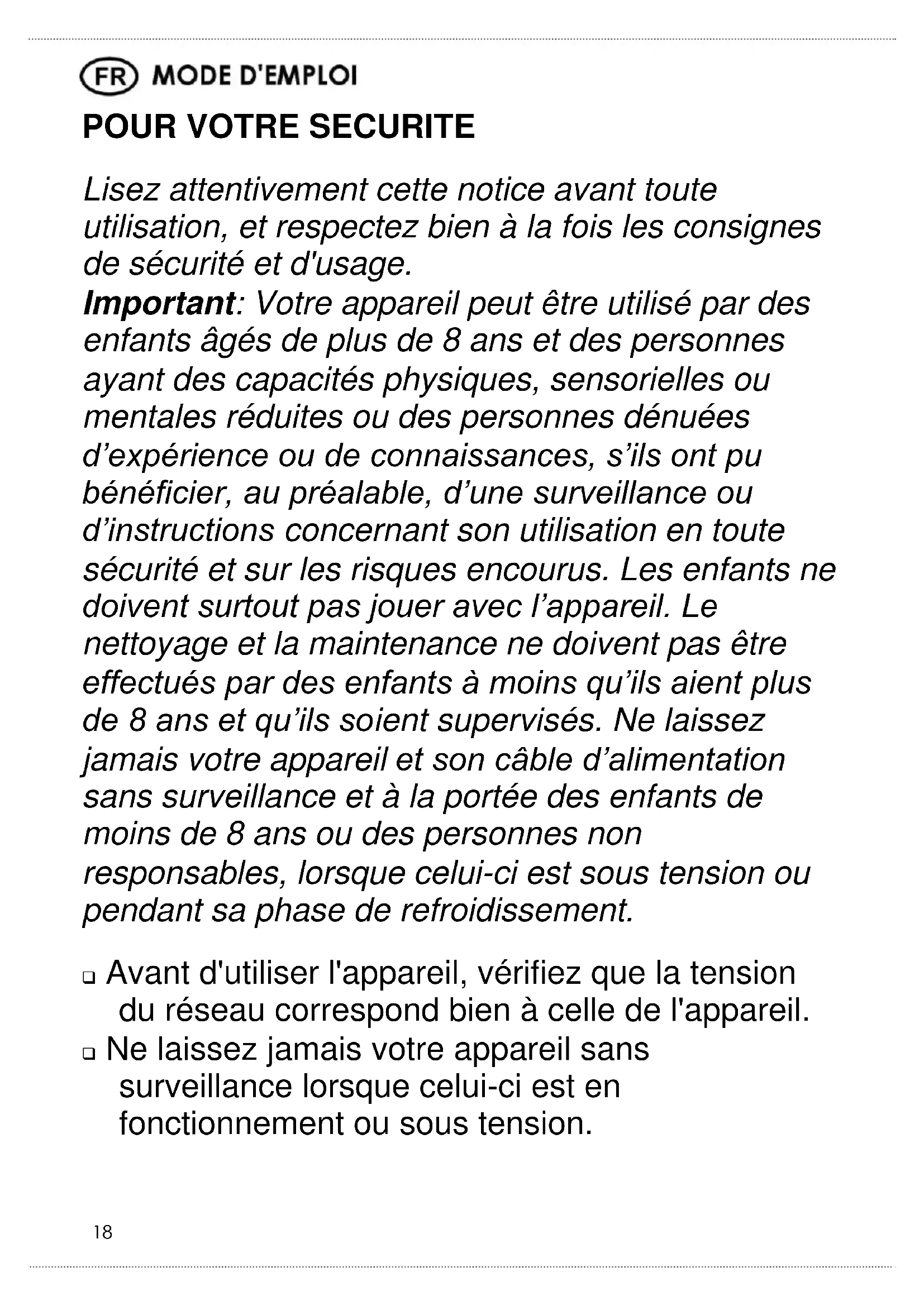 Lisez attentivement cette notice avant toute utilisation, et respectez bien à la fois les consignes de sécurité et d'usage. Important: Votre appareil peut être utilisé par des enfants âgés de plus de 8 ans et des personnes ayant des capacités physiques, sensorielles ou mentales réduites ou des personnes dénuées d’expérience ou de connaissances, s’ils ont pu bénéficier, au préalable, d’une surveillance ou d’instructions concernant son utilisation en toute sécurité et sur les risques encourus. Les enfants ne doivent surtout pas jouer avec l’appareil. Le nettoyage et la maintenance ne doivent pas être effectués par des enfants à moins qu’ils aient plus de 8 ans et qu’ils soient supervisés. Ne laissez jamais votre appareil et son câble d’alimentation sans surveillance et à la portée des enfants de moins de 8 ans ou des personnes non responsables, lorsque celui-ci est sous tension ou pendant sa phase de refroidissement. Avant d'utiliser l'appareil, vérifiez que la tension du réseau correspond bien à celle de l'appareil. Ne laissez jamais votre appareil sans surveillance lorsque celui-ci est en fonctionnement ou sous tension.19