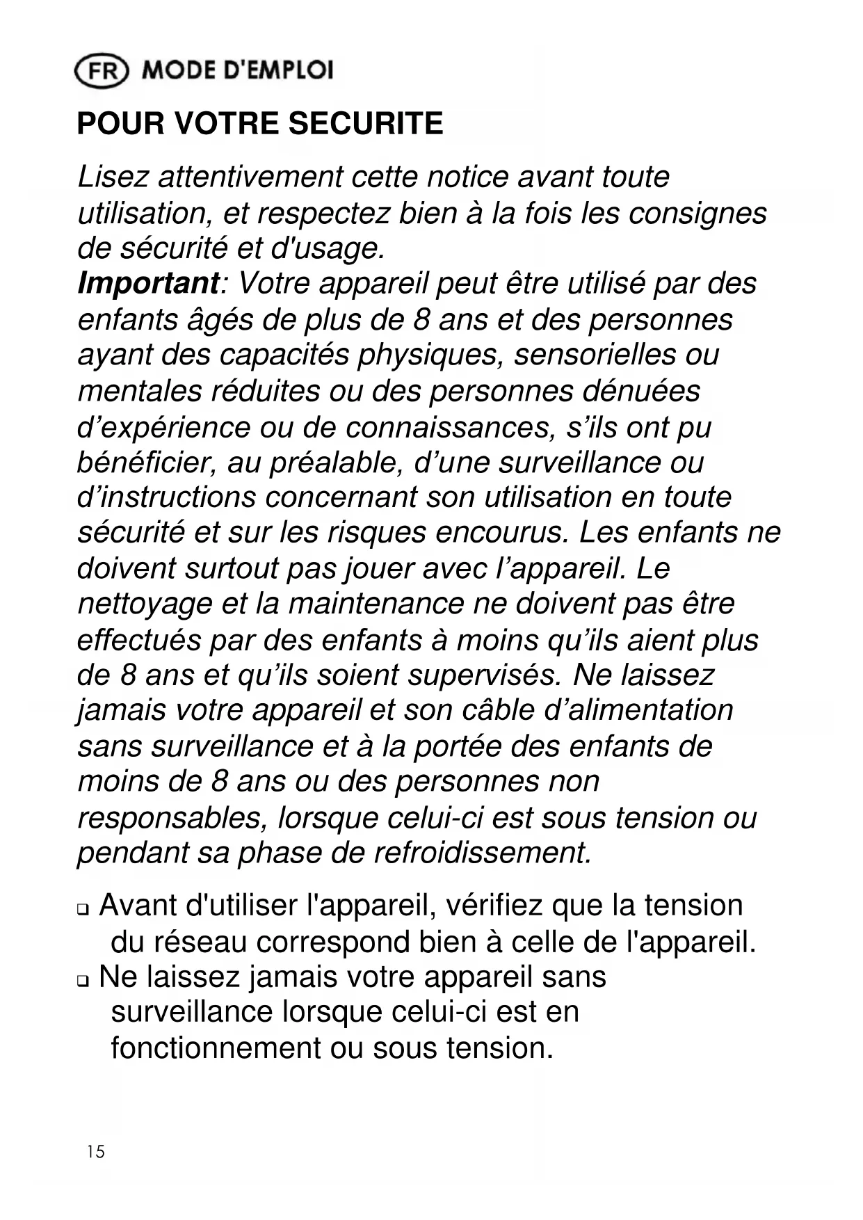 Lisez attentivement cette notice avant toute utilisation, et respectez bien à la fois les consignes de sécurité et d'usage. Important: Votre appareil peut être utilisé par des enfants âgés de plus de 8 ans et des personnes ayant des capacités physiques, sensorielles ou mentales réduites ou des personnes dénuées d’expérience ou de connaissances, s’ils ont pu bénéficier, au préalable, d’une surveillance ou d’instructions concernant son utilisation en toute sécurité et sur les risques encourus. Les enfants ne doivent surtout pas jouer avec l’appareil. Le nettoyage et la maintenance ne doivent pas être effectués par des enfants à moins qu’ils aient plus de 8 ans et qu’ils soient supervisés. Ne laissez jamais votre appareil et son câble d’alimentation sans surveillance et à la portée des enfants de moins de 8 ans ou des personnes non responsables, lorsque celui-ci est sous tension ou pendant sa phase de refroidissement. Avant d'utiliser l'appareil, vérifiez que la tension du réseau correspond bien à celle de l'appareil. Ne laissez jamais votre appareil sans surveillance lorsque celui-ci est en fonctionnement ou sous tension.16