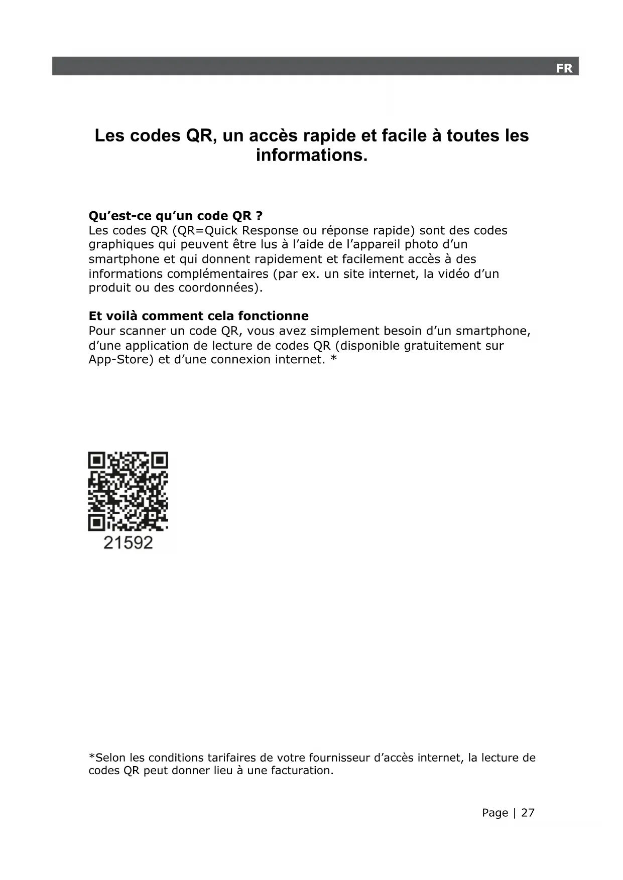 *Selon les conditions tarifaires de votre fournisseur d’accès internet, la lecture de codes QR peut donner lieu à une facturation.Page | 28