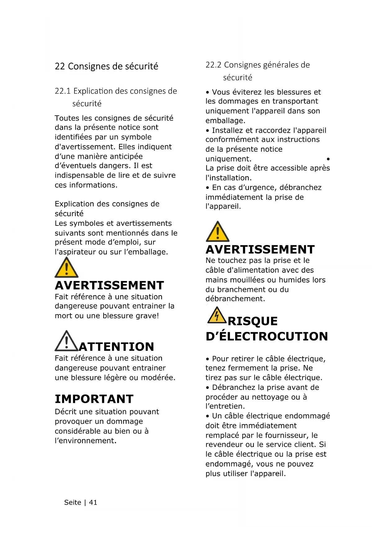 sécurité Toutes les consignes de sécurité dans la présente notice sont identifiées par un symbole d'avertissement. Elles indiquent d’une manière anticipée d’éventuels dangers. Il est indispensable de lire et de suivre ces informations. Explication des consignes de sécurité Les symboles et avertissements suivants sont mentionnés dans le présent mode d’emploi, sur l'aspirateur ou sur l’emballage. AVERTISSEMENT Fait référence à une situation dangereuse pouvant entrainer la mort ou une blessure grave! ATTENTION Fait référence à une situation dangereuse pouvant entrainer une blessure légère ou modérée. IMPORTANT Décrit une situation pouvant provoquer un dommage considérable au bien ou à l’environnement.