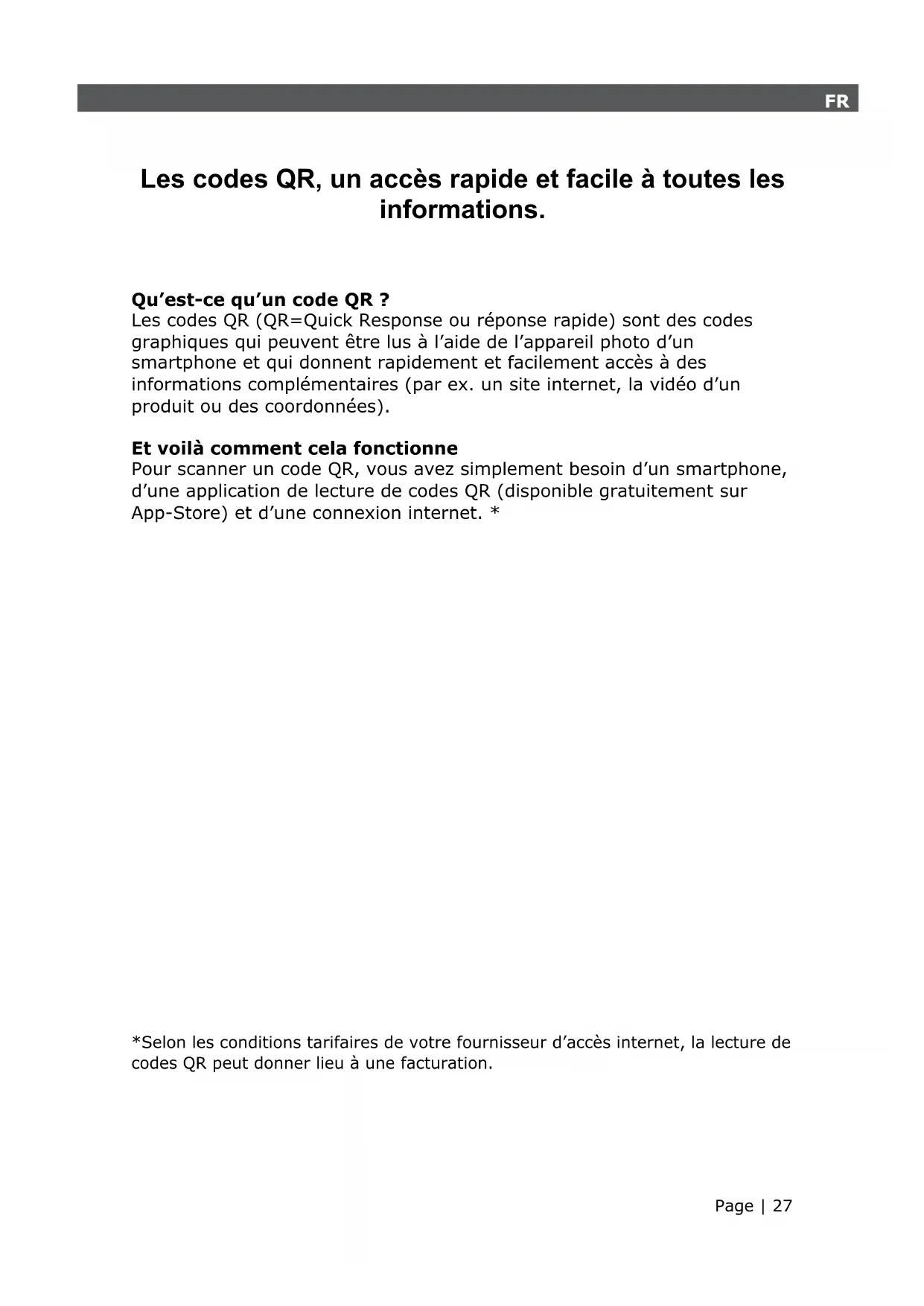 *Selon les conditions tarifaires de votre fournisseur d’accès internet, la lecture de codes QR peut donner lieu à une facturation.Page | 28