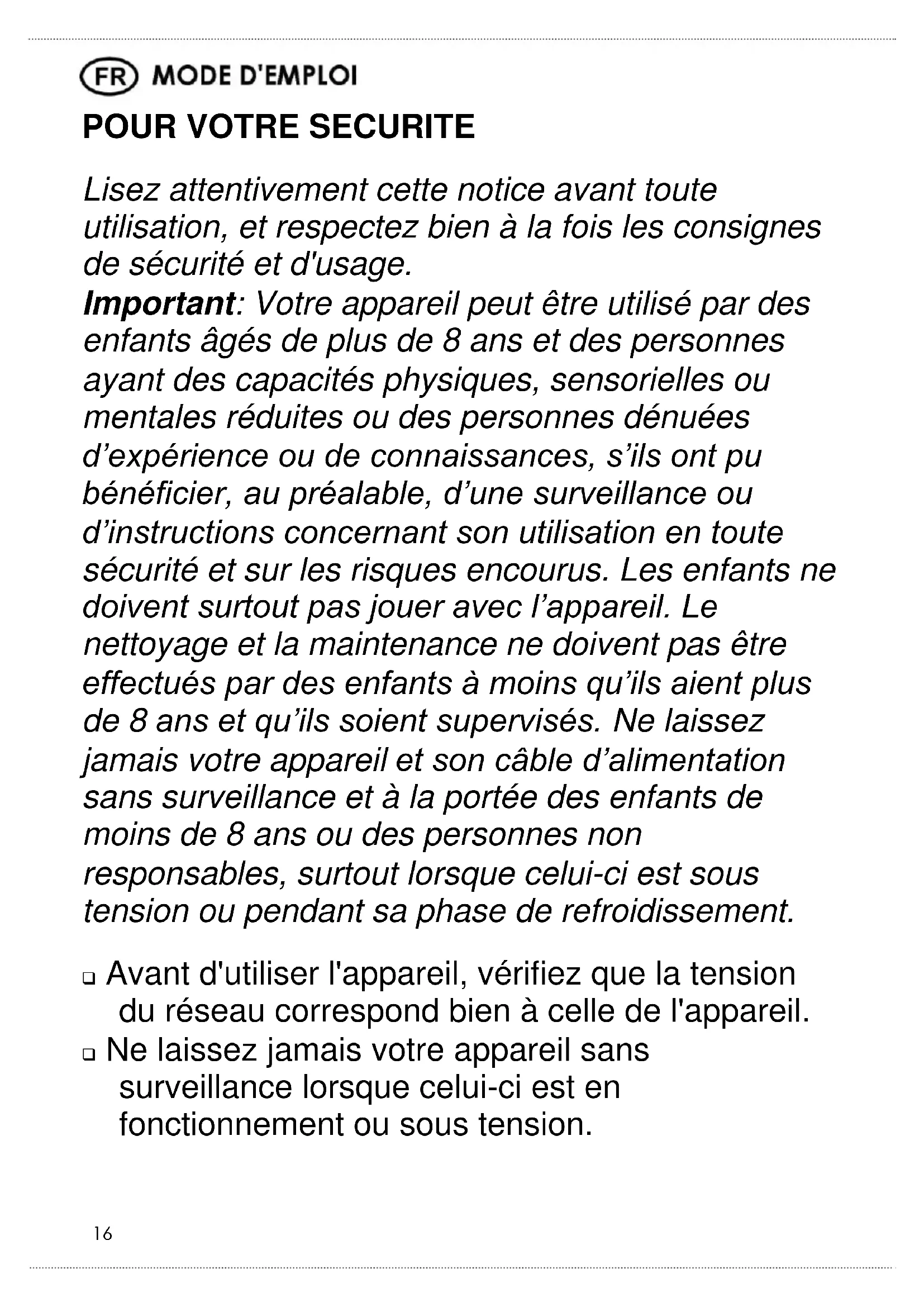 Lisez attentivement cette notice avant toute utilisation, et respectez bien à la fois les consignes de sécurité et d'usage. Important: Votre appareil peut être utilisé par des enfants âgés de plus de 8 ans et des personnes ayant des capacités physiques, sensorielles ou mentales réduites ou des personnes dénuées d’expérience ou de connaissances, s’ils ont pu bénéficier, au préalable, d’une surveillance ou d’instructions concernant son utilisation en toute sécurité et sur les risques encourus. Les enfants ne doivent surtout pas jouer avec l’appareil. Le nettoyage et la maintenance ne doivent pas être effectués par des enfants à moins qu’ils aient plus de 8 ans et qu’ils soient supervisés. Ne laissez jamais votre appareil et son câble d’alimentation sans surveillance et à la portée des enfants de moins de 8 ans ou des personnes non responsables, surtout lorsque celui-ci est sous tension ou pendant sa phase de refroidissement. Avant d'utiliser l'appareil, vérifiez que la tension du réseau correspond bien à celle de l'appareil. Ne laissez jamais votre appareil sans surveillance lorsque celui-ci est en fonctionnement ou sous tension.17