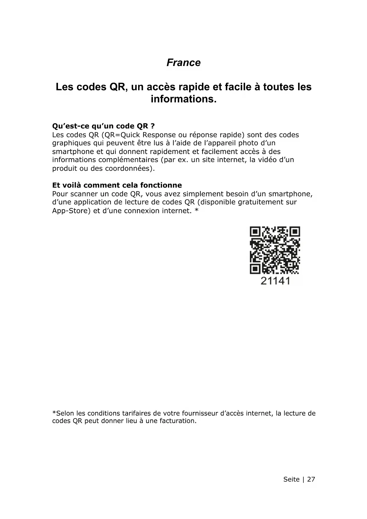 Selon les conditions tarifaires de votre fournisseur d'accès internet, la lecture de codes QR peut donner lieu à une facturation.
