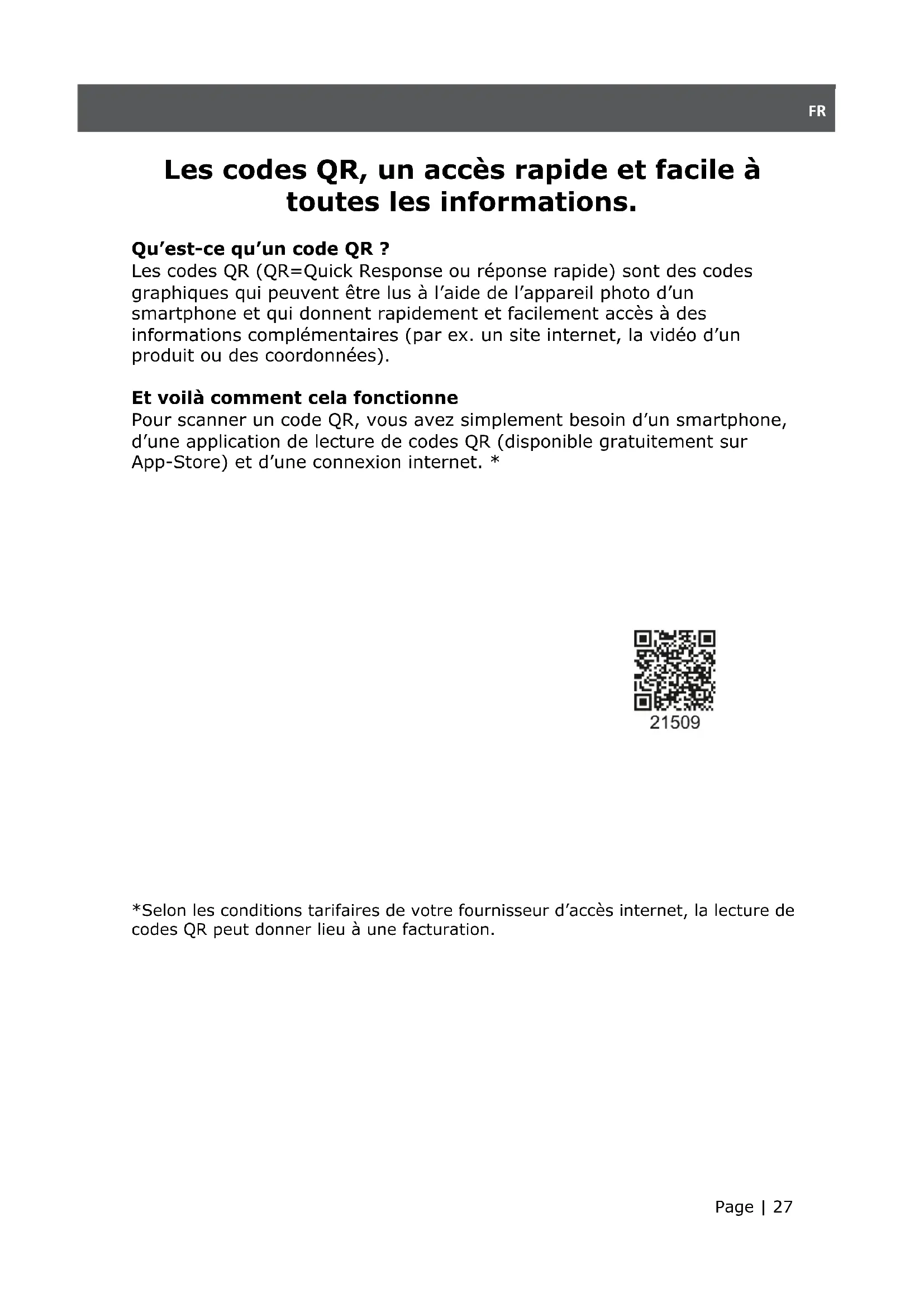 Selon les conditions tarifaires de votre fournisseur d'accès internet, la lecture de codes QR peut donner lieu à une facturation.