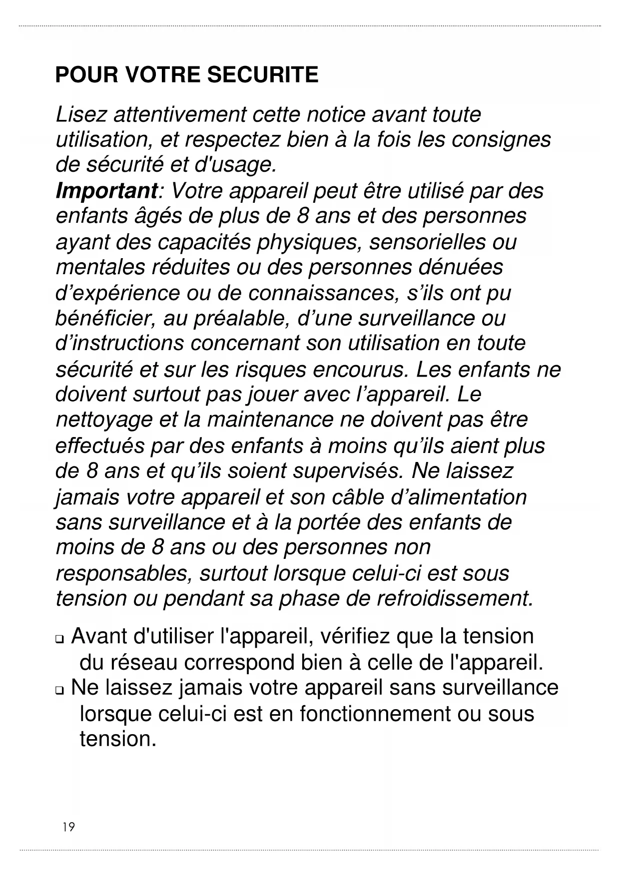 Lisez attentivement cette notice avant toute utilisation, et respectez bien à la fois les consignes de sécurité et d'usage. Important: Votre appareil peut être utilisé par des enfants âgés de plus de 8 ans et des personnes ayant des capacités physiques, sensorielles ou mentales réduites ou des personnes dénuées d’expérience ou de connaissances, s’ils ont pu bénéficier, au préalable, d’une surveillance ou d’instructions concernant son utilisation en toute sécurité et sur les risques encourus. Les enfants ne doivent surtout pas jouer avec l’appareil. Le nettoyage et la maintenance ne doivent pas être effectués par des enfants à moins qu’ils aient plus de 8 ans et qu’ils soient supervisés. Ne laissez jamais votre appareil et son câble d’alimentation sans surveillance et à la portée des enfants de moins de 8 ans ou des personnes non responsables, surtout lorsque celui-ci est sous tension ou pendant sa phase de refroidissement. Avant d'utiliser l'appareil, vérifiez que la tension du réseau correspond bien à celle de l'appareil. Ne laissez jamais votre appareil sans surveillance lorsque celui-ci est en fonctionnement ou sous tension.20
