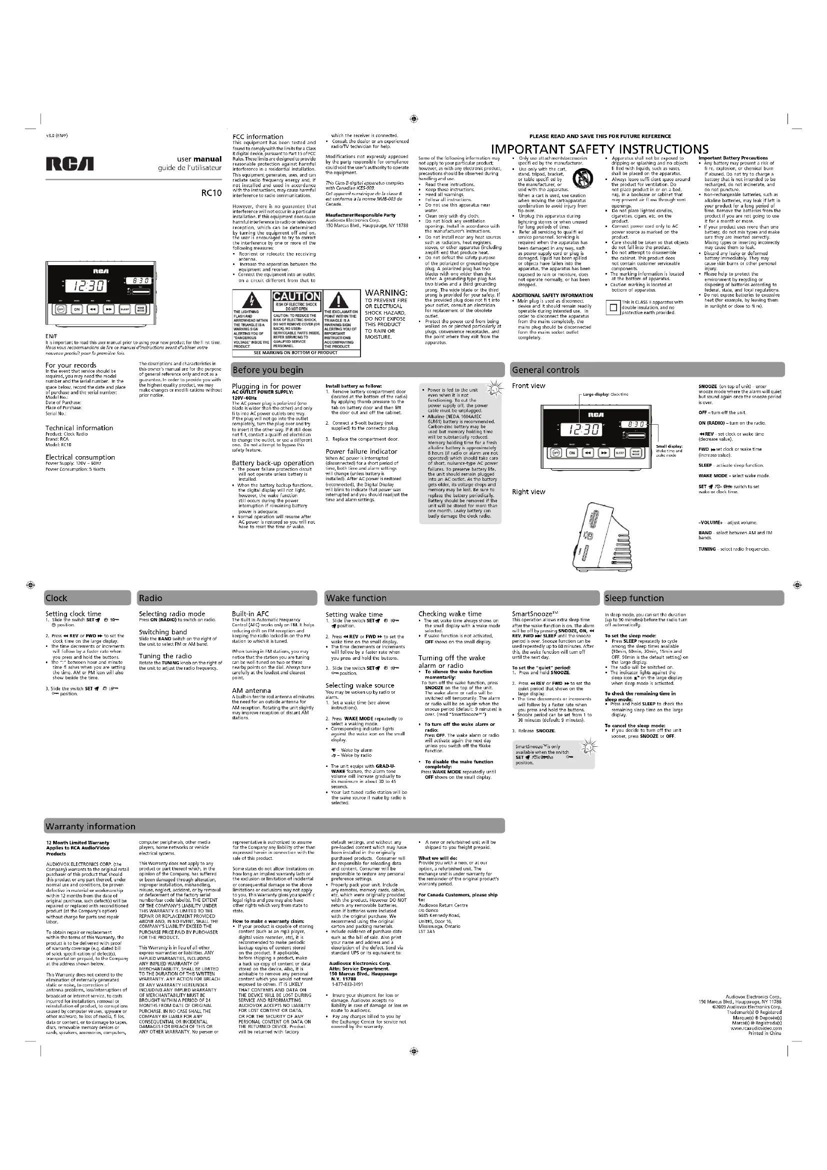 - Prendre garde que des objets ne tombent pas dans l’appareil. Archives Selon certaines lois provinciales, et au cas où vous aviez besoin de service, il se peut que vous ayez besoin du numéro de modèle et du numéro de série. Dans l’e-space ci-dessous, enregistrez la date et l’endroit d’achat, ainsi que le numéro de série: No. de modèle: Date d’achat Endroit d’achat No. de série Spécifi cations techniques Produit: Radio-Réveil Marque: RCA Modèle: RC10 Consommation de courant: Source d’alimentation: 120V~60Hz Consommation d’énergie: 5 Watts Les descriptions et les caractéristiques décrites dans ce document représentent une indication générale et ne constitue pas une garantie. Afi n d’offrir la meilleure qualité de produit possible, nous nous réservons le droit de faire toute amélioration ou modifi cation et ce, sans préavis. SmartSnooze
