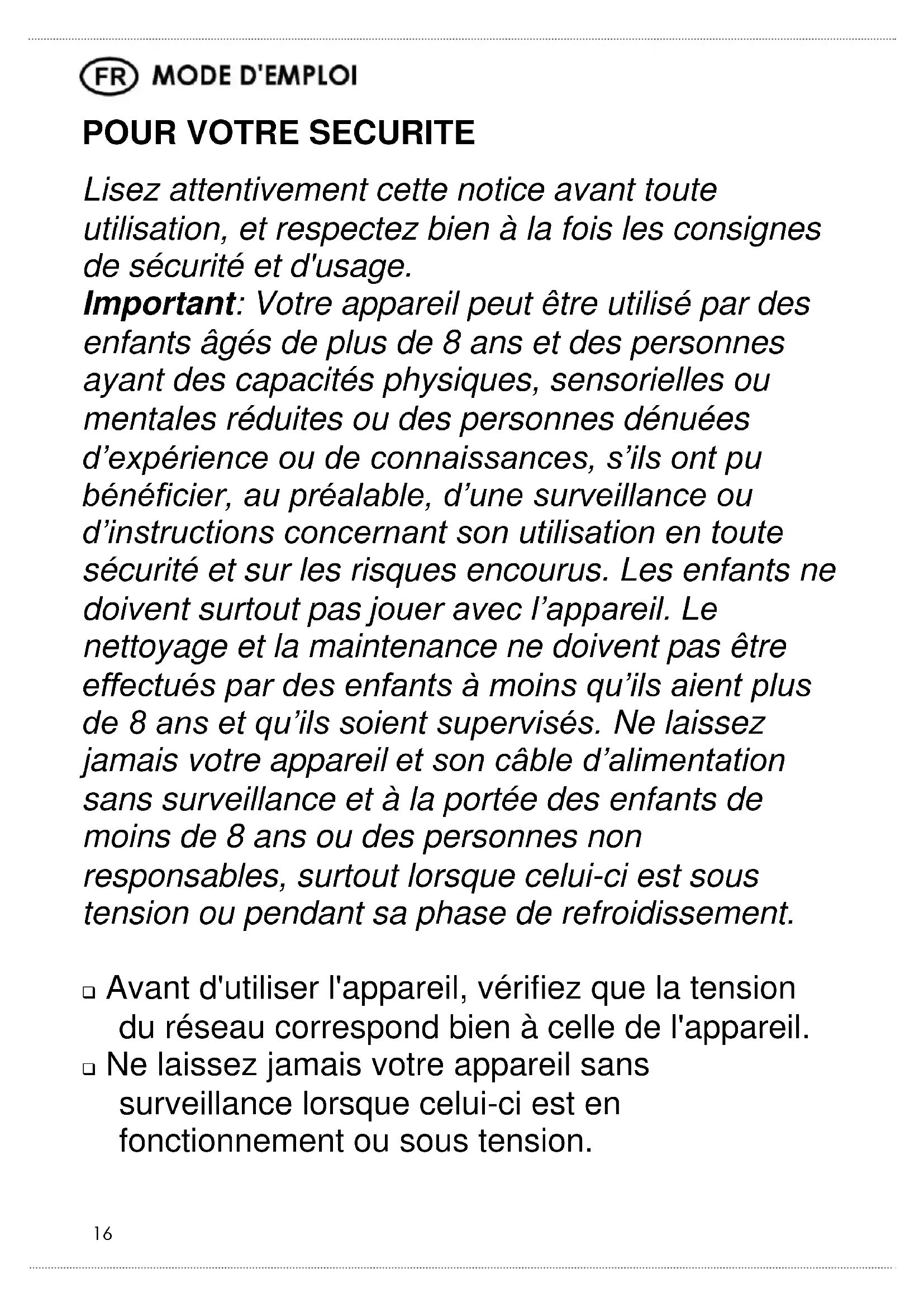Lisez attentivement cette notice avant toute utilisation, et respectez bien à la fois les consignes de sécurité et d'usage. Important: Votre appareil peut être utilisé par des enfants âgés de plus de 8 ans et des personnes ayant des capacités physiques, sensorielles ou mentales réduites ou des personnes dénuées d’expérience ou de connaissances, s’ils ont pu bénéficier, au préalable, d’une surveillance ou d’instructions concernant son utilisation en toute sécurité et sur les risques encourus. Les enfants ne doivent surtout pas jouer avec l’appareil. Le nettoyage et la maintenance ne doivent pas être effectués par des enfants à moins qu’ils aient plus de 8 ans et qu’ils soient supervisés. Ne laissez jamais votre appareil et son câble d’alimentation sans surveillance et à la portée des enfants de moins de 8 ans ou des personnes non responsables, surtout lorsque celui-ci est sous tension ou pendant sa phase de refroidissement. Avant d'utiliser l'appareil, vérifiez que la tension du réseau correspond bien à celle de l'appareil. Ne laissez jamais votre appareil sans surveillance lorsque celui-ci est en fonctionnement ou sous tension.17