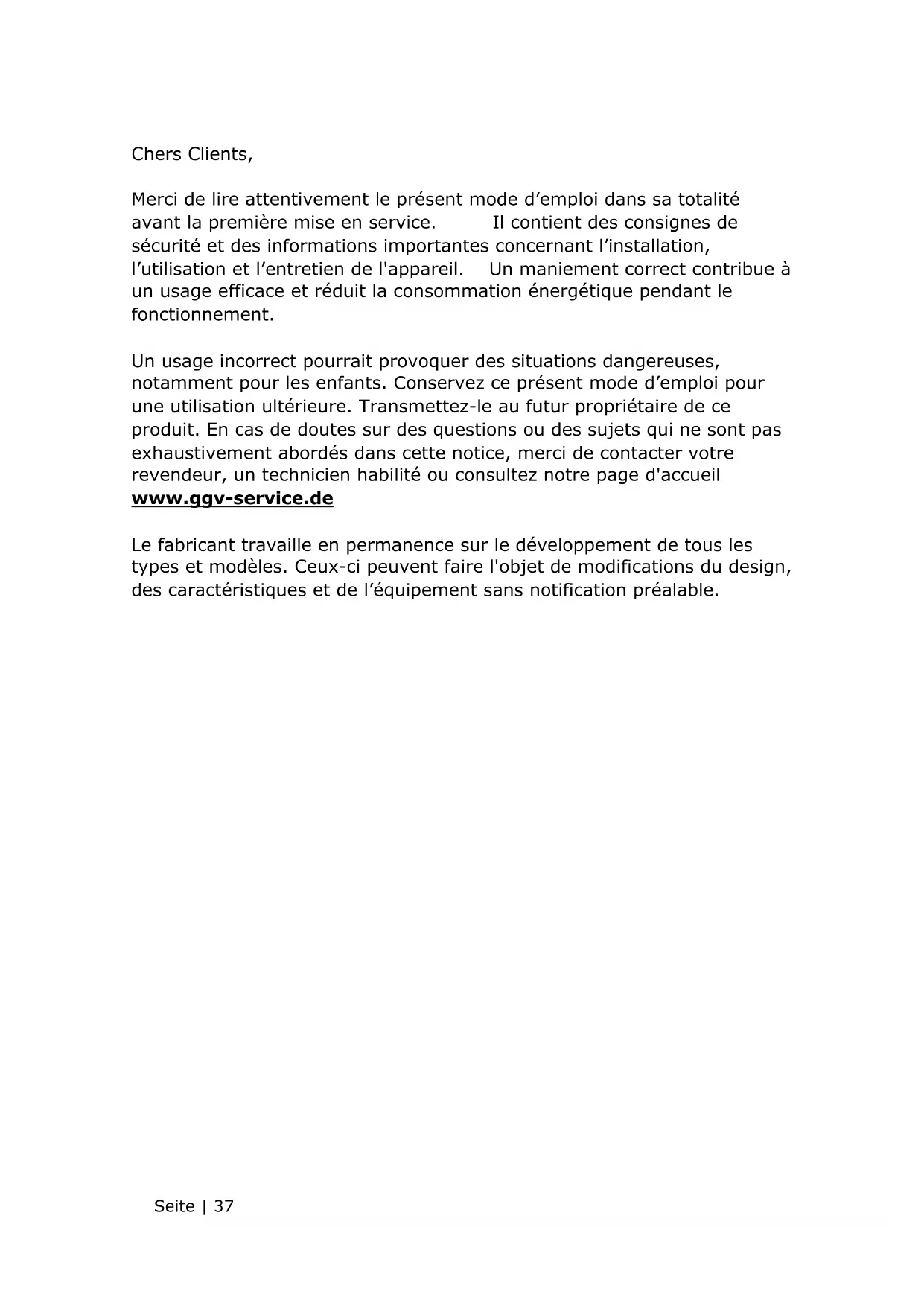 CE-Marking At the time of its introduction on the market the product fulfills the requirements, which were specified in the directive for the standardization of the laws of the Member States concerning the electromagnetic compatibility (2014/30/EU) of electrical equipment within certain voltage limits (2014/35/EU). This product is identified by the CE marking and delivered with a declaration of conformity for inspection by the market monitoring authority. *Subject to change without notice*Seite | 37 Chers Clients, Merci de lire attentivement le présent mode d’emploi dans sa totalité avant la première mise en service. Il contient des consignes de sécurité et des informations importantes concernant l’installation, l’utilisation et l’entretien de l'appareil. Un maniement correct contribue à un usage efficace et réduit la consommation énergétique pendant le fonctionnement. Un usage incorrect pourrait provoquer des situations dangereuses, notamment pour les enfants. Conservez ce présent mode d’emploi pour une utilisation ultérieure. Transmettez-le au futur propriétaire de ce produit. En cas de doutes sur des questions ou des sujets qui ne sont pas exhaustivement abordés dans cette notice, merci de contacter votre revendeur, un technicien habilité ou consultez notre page d'accueil www.ggv-service.de Le fabricant travaille en permanence sur le développement de tous les types et modèles. Ceux-ci peuvent faire l'objet de modifications du design, des caractéristiques et de l’équipement sans notification préalable.Seite | 38 Aller rapidement et facilement au but avec les codes QR Les codes QR, qu‘est-ce? Les codes QR (QR = Quick Response) sont des codes graphiques qui peuvent etre lus a l‘aide d‘un appareil photo du smartphone et qui contiennent par exemple un lien vers un site Internet ou des donnees de contact. Votre avantage: plus de frappe contraignante d‘adresses Internet ou de donnees de contact! Comment faire? Pour scanner les codes QR, vous avez simplement besoin d‘un smartphone, d‘un lecteur de codes QR installe ainsi que d‘une connexion Internet*. Vous trouverez generalement un lecteur de codes QR gratuitement dans l‘App Store de votre smartphone.
