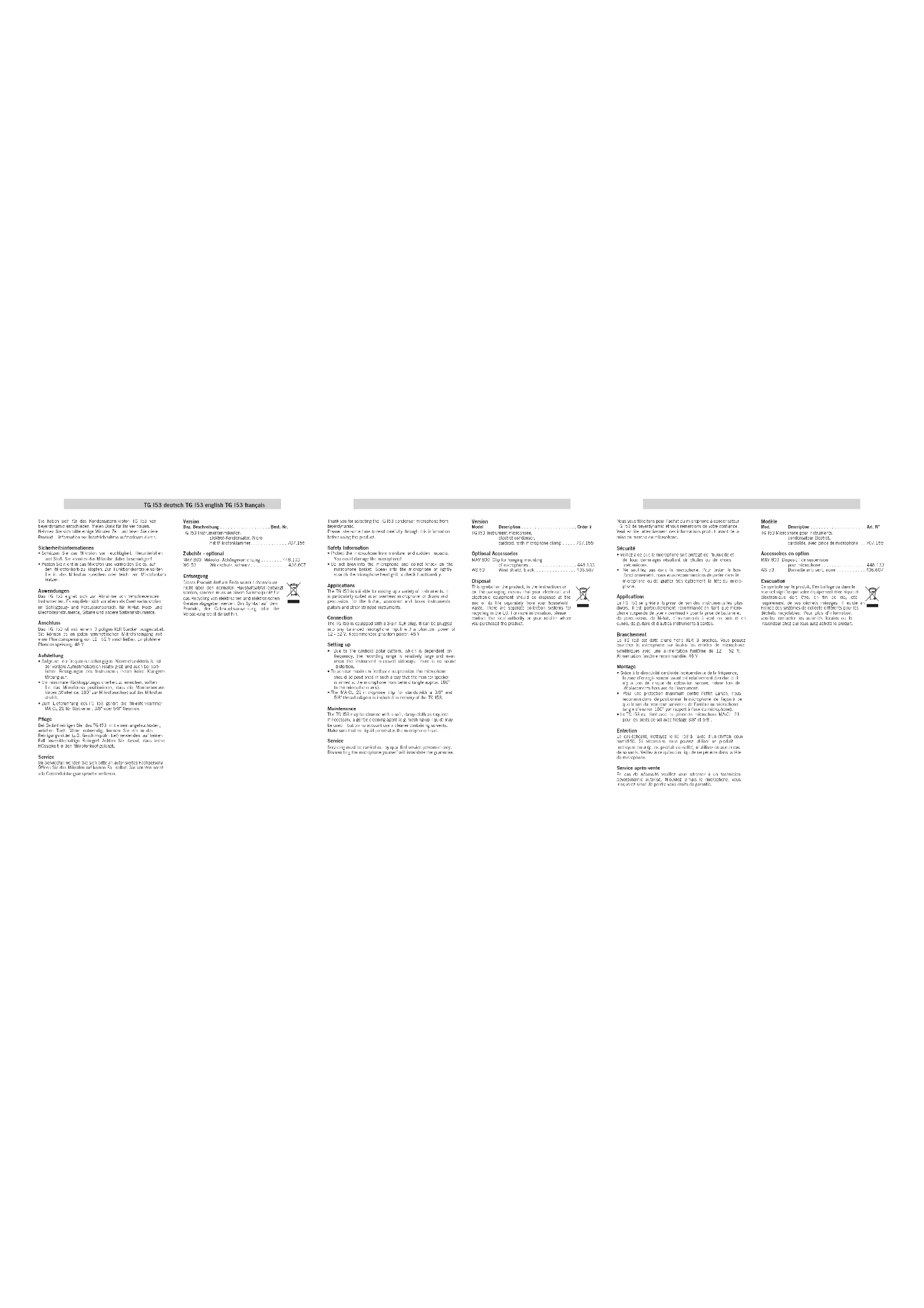 - Le TG I53 est livré avec la pince de microphone MA-CL 21 pour les pieds de sol avec filetage 3/8" et 5/8". Entretien Le cas échéant, nettoyez le TG I53 à l’aide d’un chiffon doux humidifié. Si nécessaire, vous pouvez utiliser un produit nettoyant doux (p. ex. produit vaisselle), n’utilisez en aucun cas de solvants. Veillez à ce qu’aucun liquide ne pénètre dans la tête de microphone. Service après-vente En cas de nécessité veuillez vous adresser à un technicien beyerdynamic autorisé. N’ouvrez jamais le microphone, vous risquerez sinon de perdre vous droits de garantie. Modèle Mod. Description . . . . . . . . . . . . . . . . . . . . . Art. N° TG I53 Microphone pour instruments, condensateur électret, cardioïde, avec pince de microphone . . 707.155 Accessoires en option MAV 800 Dispositif de suspension pour microphone . . . . . . . . . . . . . . . . . 448.133 WS 53 Bonnette anti-vent, noire . . . . . . . . . . . 436.607 Evacuation Ce symbole sur le produit, l’emballage ou dans le manuel signifie que votre équipement électrique et électronique doit être, en fin de vie, jeté séparement de vos déchets ménages. Il existe en France des systèmes de collecte différents pour les déchets recyclables. Pour plus d’information, veuillez contacter les autorités locales ou le revendeur chez qui vous avez acheté le produit.TG I53 english TG I53 françaisTG I53 deutsch Technical Specifications Transducer type . . . . . . . . . . . . . . . Condenser (back electret) Operating principle . . . . . . . . . . . . . Pressure gradient Polar pattern . . . . . . . . . . . . . . . . . Cardioid Frequency response: Close miking . . . . . . . . . . . . . . . . 20 - 20,000 Hz Distant miking (measured at 1 m). . . 35 - 20,000 Hz Open circuit voltage . . . . . . . . . . . . 6.8 mV/Pa (-43.4 dBV) ±2.5 dB Nominal impedance . . . . . . . . . . . . 200 Ω Load impedance . . . . . . . . . . . . . . . ≥ 1 kΩ Max. SPL at 24 V and 48 V phantom power . . . . 140 dB S/N ratio . . . . . . . . . . . . . . . . . . . . 61 dB [CCIR; Q-Peak] 71 dB [A; RMS] Equivalent SPL. . . . . . . . . . . . . . . . 23 dB [A; RMS] 33 dB [CCIR; Q-Peak] Power supply . . . . . . . . . . . . . . . . . Phantom power: P12; P24; P48 (recommended: 48 V) Power consumption. . . . . . . . . . . . . 4.7 mA Connection. . . . . . . . . . . . . . . . . . . XLR, 3-pin, male Dimensions . . . . . . . . . . . . . . . . . . 100 x 19.5 mm Weight (without clamp) . . . . . . . . . . 36 g Spécifications techniques Type de transducteur . . . . . . . . . . . Condensateur (back-électret) Principe de travail . . . . . . . . . . . . . Gradient de pression Directivité . . . . . . . . . . . . . . . . . . . Cardioïde Bande passante: à proximité . . . . . . . . . . . . . . . . . 20 à 20 000 Hz à distance (distance 1 m) . . . . . . 35 à 20 000 Hz Efficacité en champs libre. . . . . . . . 6,8 mV/Pa (-43,4 dBV) ±2,5 dB Impédance nominale. . . . . . . . . . . . 200 Ω Impédance de charge min. . . . . . . . ≥ 1 kΩ Pression sonore max. avec 24 V et 48 V alimentation fantôme. . . . . . . . . . . . . 140 dB Rapport signal-bruit . . . . . . . . . . . . 61 dB [CCIR; Q-Peak] 71 dB [A; RMS] Niveau de pression sonore équivalent. . . 23 dB [A; RMS] 33 dB [CCIR; Q-Peak] Alimentation . . . . . . . . . . . . . . . . . Fantôme: P12; P24; P48 (recommandée: 48 V) Consommation . . . . . . . . . . . . . . . . 4,7 mA Connecteur. . . . . . . . . . . . . . . . . . . XLR, 3 broches, mâle Dimensions . . . . . . . . . . . . . . . . . . 100 x 19,5 mm Poids (sans pince) . . . . . . . . . . . . . 36 g Technische Daten Wandlerprinzip . . . . . . . . . . . . . . . . Kondensator (Back-Elektret) Arbeitsprinzip. . . . . . . . . . . . . . . . . Druckgradientenempfänger Richtcharakteristik . . . . . . . . . . . . . Niere Übertragungsbereich: Nahfeld . . . . . . . . . . . . . . . . . . . 20 - 20.000 Hz Fernfeld (Entfernung 1 m) . . . . . . 35 - 20.000 Hz Feldleerlaufübertragungsfaktor . . . . . 6,8 mV/Pa (-43,4 dBV) ±2,5 dB Nennimpedanz . . . . . . . . . . . . . . . . 200 Ω Nennabschlussimpedanz . . . . . . . . . ≥ 1 kΩ Max. Grenzschalldruckpegel bei 24 V u. 48 V Phantomspeisung. . . 140 dB Geräuschspannungsabstand. . . . . . . 61 dB [CCIR; Q-Peak] 71 dB [A; RMS] Äquivalentschalldruckpegel . . . . . . . 23 dB [A; RMS] 33 dB [CCIR; Q-Peak] Spannungsversorgung . . . . . . . . . . . Phantomspeisung: P12; P24; P48 (empfohlen: 48 V) Stromaufnahme . . . . . . . . . . . . . . . 4,7 mA Anschluss . . . . . . . . . . . . . . . . . . . XLR, 3-pol., male Abmessungen. . . . . . . . . . . . . . . . . 100 x 19,5 mm Gewicht (ohne Klammer) . . . . . . . . . 36 g +20 +10 0 dB