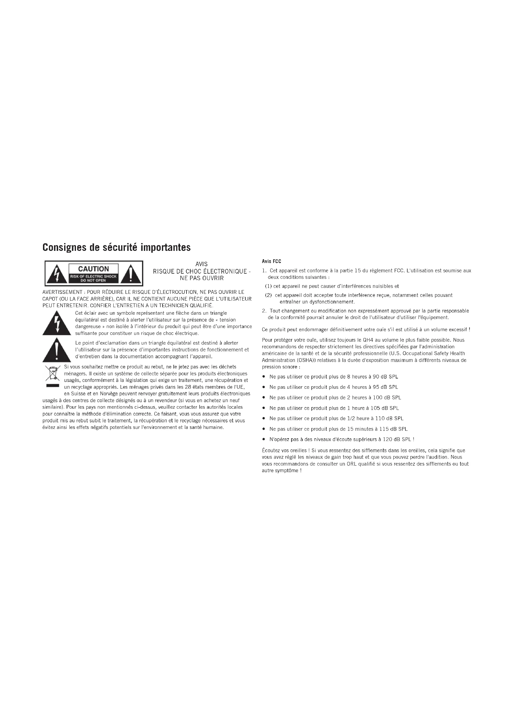 Ce produit peut endommager définitivement votre ouïe s'il est utilisé à un volume excessif! Pour protéger votre ouïe, utilisez toujours le QH4 au volume le plus faible possible. Nous recommandons de respecter strictement les directives spécifiées par l'administration américaine de la santé et de la sécurité professionnelle (U.S. Occupational Safety Health Administration (OSHA)) relatives à la durée d'exposition maximum à différents niveaux de pression sonore: