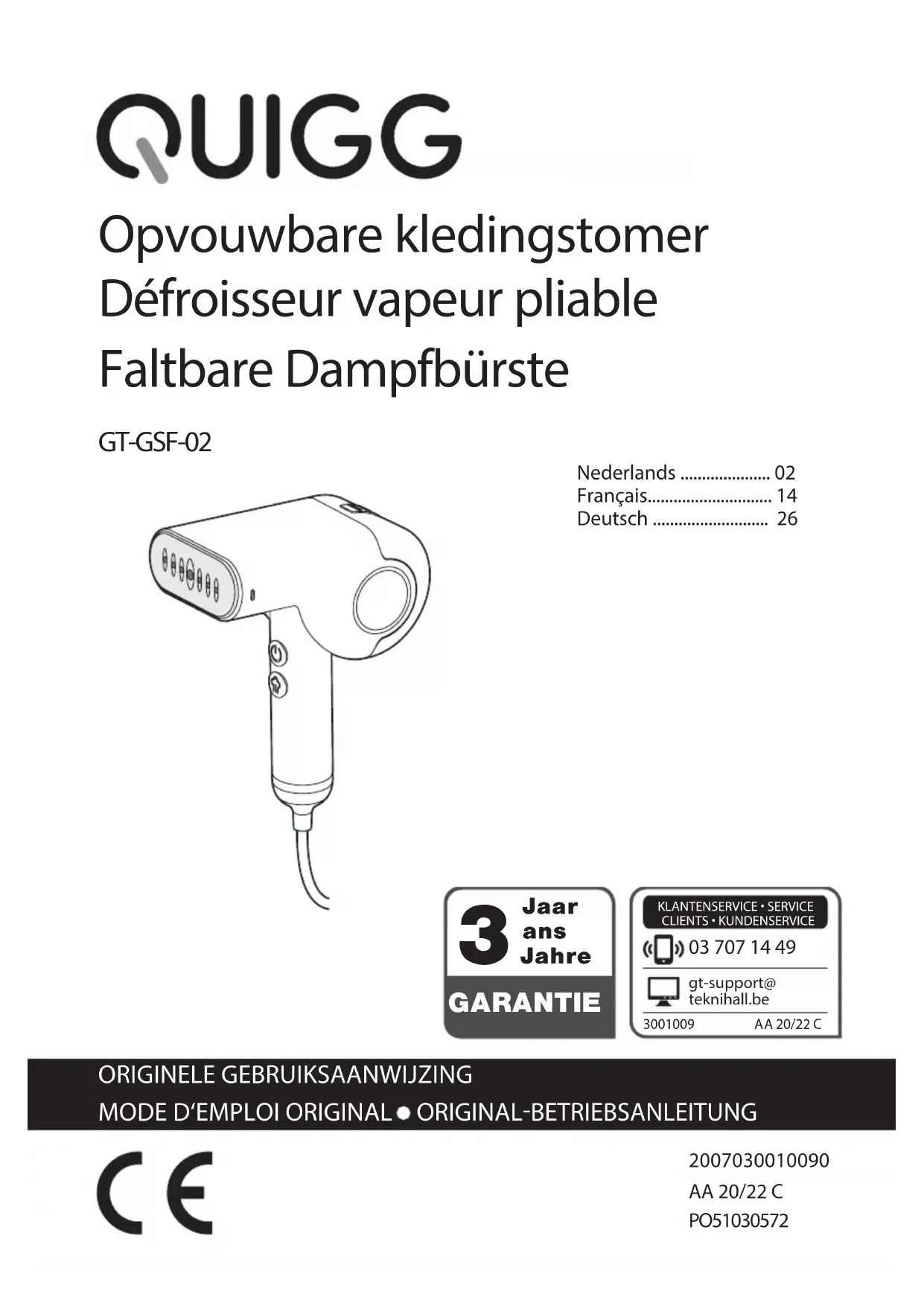 ger l’appareil de manière compacte. Druckbuch DBuerste faltbar BEL.indb 23Druckbuch DBuerste faltbar BEL.indb 23 03.11.2021 12:49:0503.11.2021 12:49:05Dépannage Problème Cause possible/solution Aucune fonction disponible / la défrois- seur vapeur ne produit pas de vapeur. La che secteur est-elle branchée dans la prise murale ? Le réservoir d’eau 4 est-il susam- ment rempli et bien inséré ? De l’eau coule de l’appareil. Le bouchon est-il bien fermé et le réservoir d’eau bien inséré ? Données techniques Modèle : GT-GSF-02 Tension d’alimentation : 220-240 V~, 50 Hz Puissance : 1400-1600 W Contenance du réservoir : ca. 110 ml Classe de protection : I Numéro de révision : 2022_01 Nos produits étant constamment améliorés, nous nous réservons le droit de modifier la forme et les caractéristiques techniques sans préavis. La notice d’utilisation actuelle peut être téléchargée sur notre page Internet www.gt-support.de. Déclaration de conformité La conformité de ce produit avec les normes légales est garantie. Vous trouverez la déclaration de conformité intégrale sur internet sous www.gt-support.de.