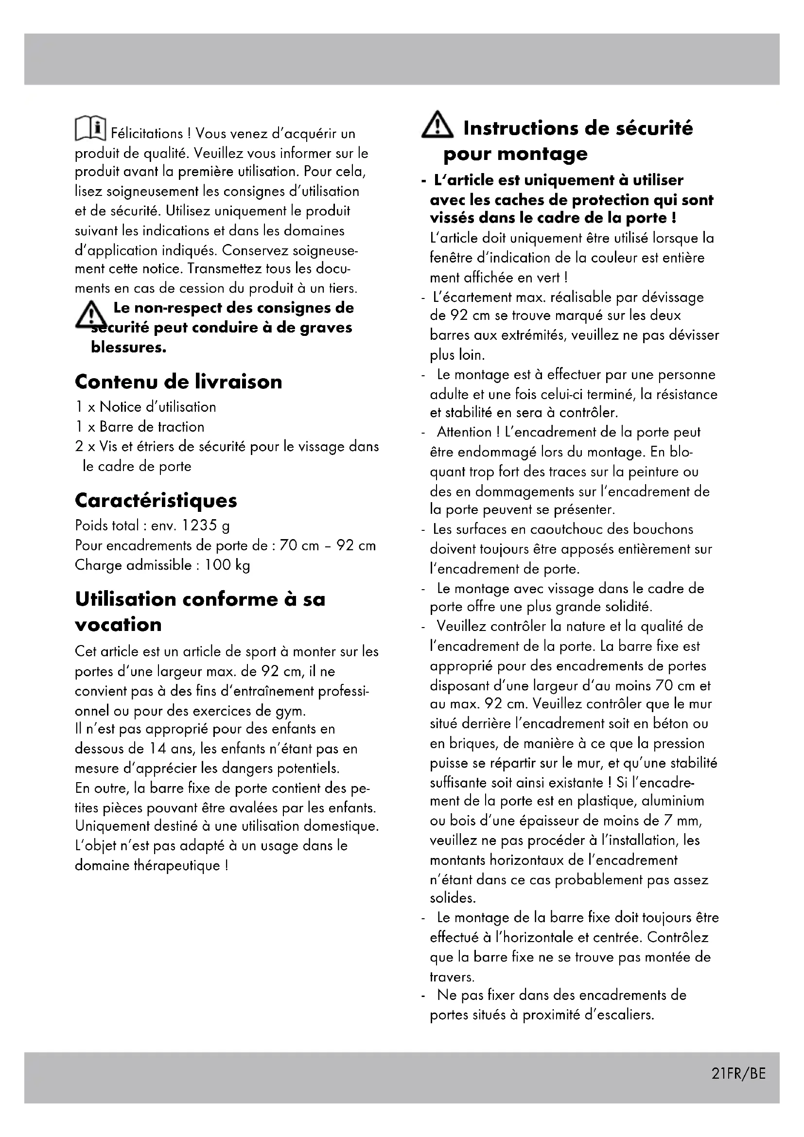 Téléchargez la notice de votre Barre de traction au format PDF gratuitement ! Retrouvez votre notice IAN 24602 - CRIVIT et reprennez votre appareil électronique en main. Sur cette page sont publiés tous les documents nécessaires à l'utilisation de votre appareil IAN 24602 de la marque CRIVIT.